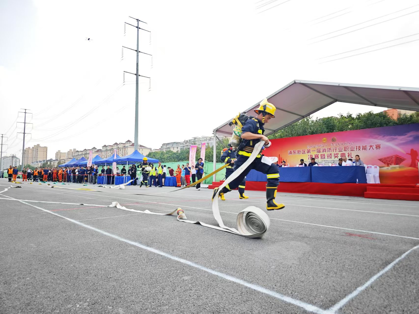 记者从决赛现场了解到,此次大赛规模宏大,由浦东新区总工会和浦东新区消防救援局联合主办,覆盖全区所有消防队、一级微站、重点企业消防队以及浦东企业负责消防安全的人员近万人。作为本次比赛的裁判之一,来自铜山消防救援站的政治指导员刘家璐告诉记者,此次比赛根据选手的组别,设置了不同的场景考察他们的消防能力。“消防微站、重点企业消防队在初期火灾的控制中起到了很重要的作用,打好坚实的基础很重要,因此平时我们也会开展练兵演习、技能竞赛等,这次邀请他们和专业组在同一赛场,也是希望大家在观摩中互相学习,全面提升消防从业人员的专业素养和综合能力。”