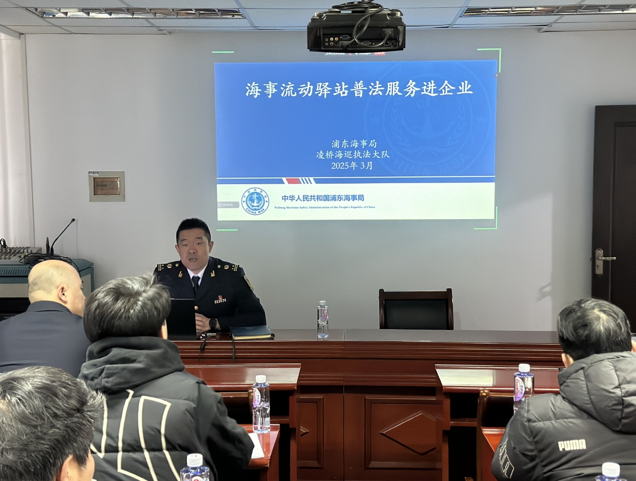 近日,浦东海事局凌桥海巡执法大队赴上海港复兴船务有限公司开展送教上门服务。这是浦东海事局“海事服务流动驿站”走进航运企业,为企业安全生产“服务上门”的又一次重要实践。