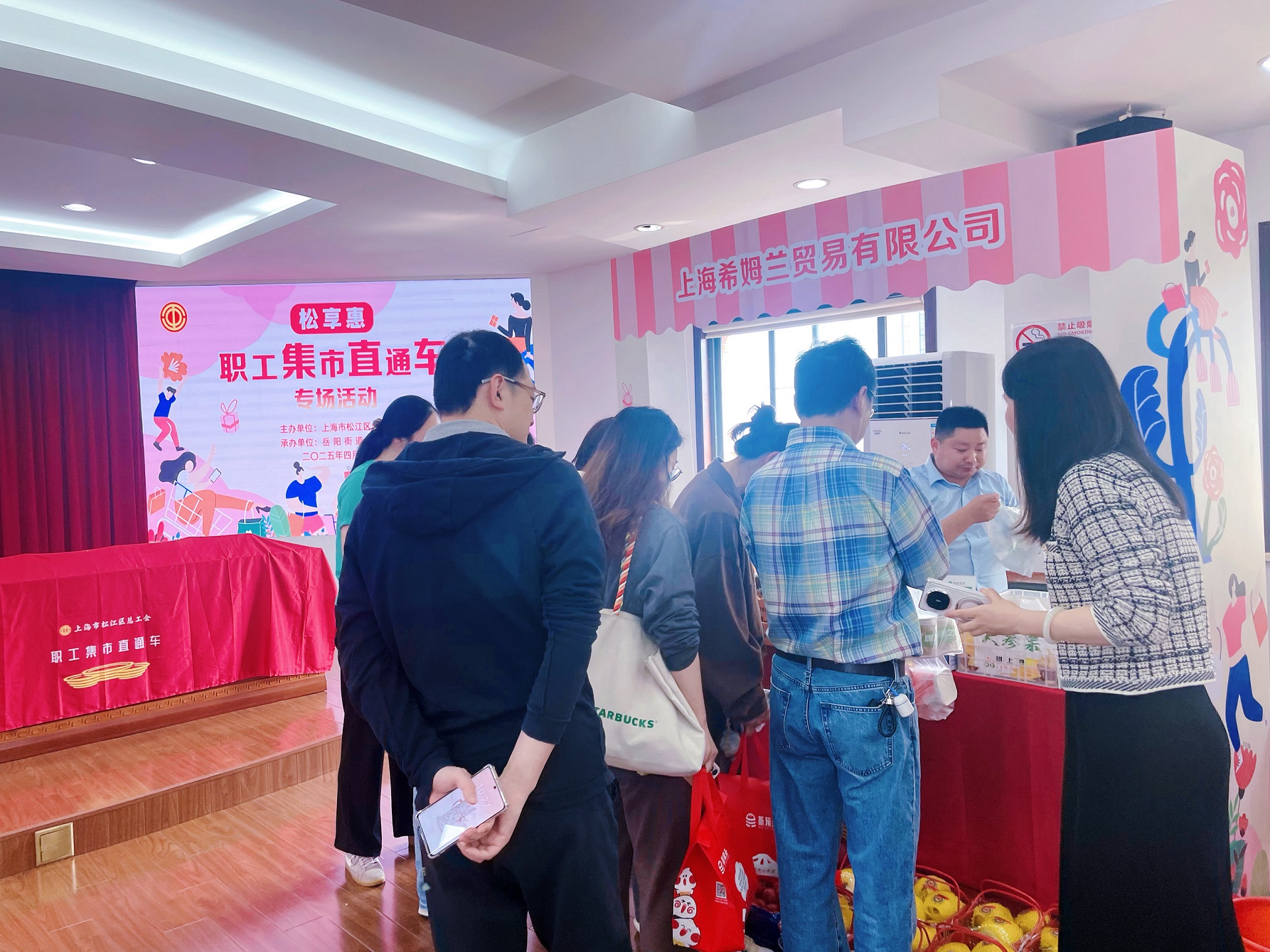 为提升职工生活品质,昨日,由松江区总工会主办、岳阳街道总工会承办的2025年首场“松享惠·职工集市直通车”专场活动在岳阳街道火热开展。