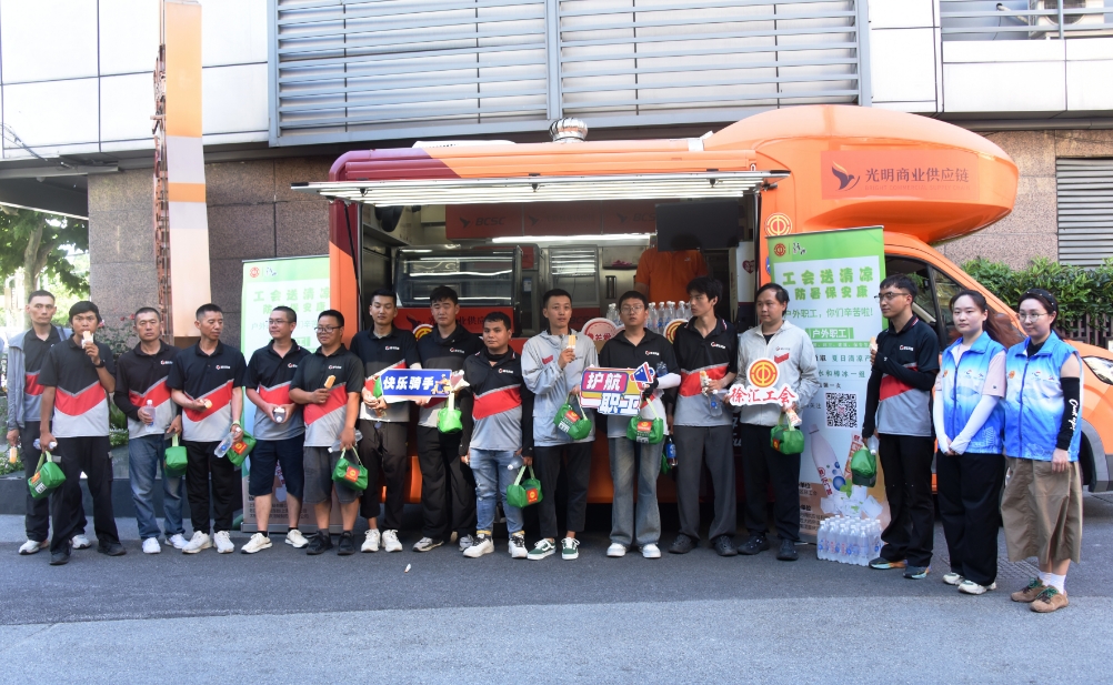 7月2日,申城最高气温攀升至37℃,高温预警再次上线,罕见的“日晕”现象虽为天空添彩,却也让户外劳动者们面临酷暑“烤”验。为切实做好高温天气下的户外职工关爱工作,徐汇区总工会联合漕河泾街道总工会、康健街道总工会,开出今年首辆“清凉关爱车”,满载着盐汽水、棒冰等解暑物资,为坚守一线的户外职工送去清凉。这是徐汇区总工会连续第三年开展“清凉关爱车”行动,随着今年天气的持续升温而提前开出。