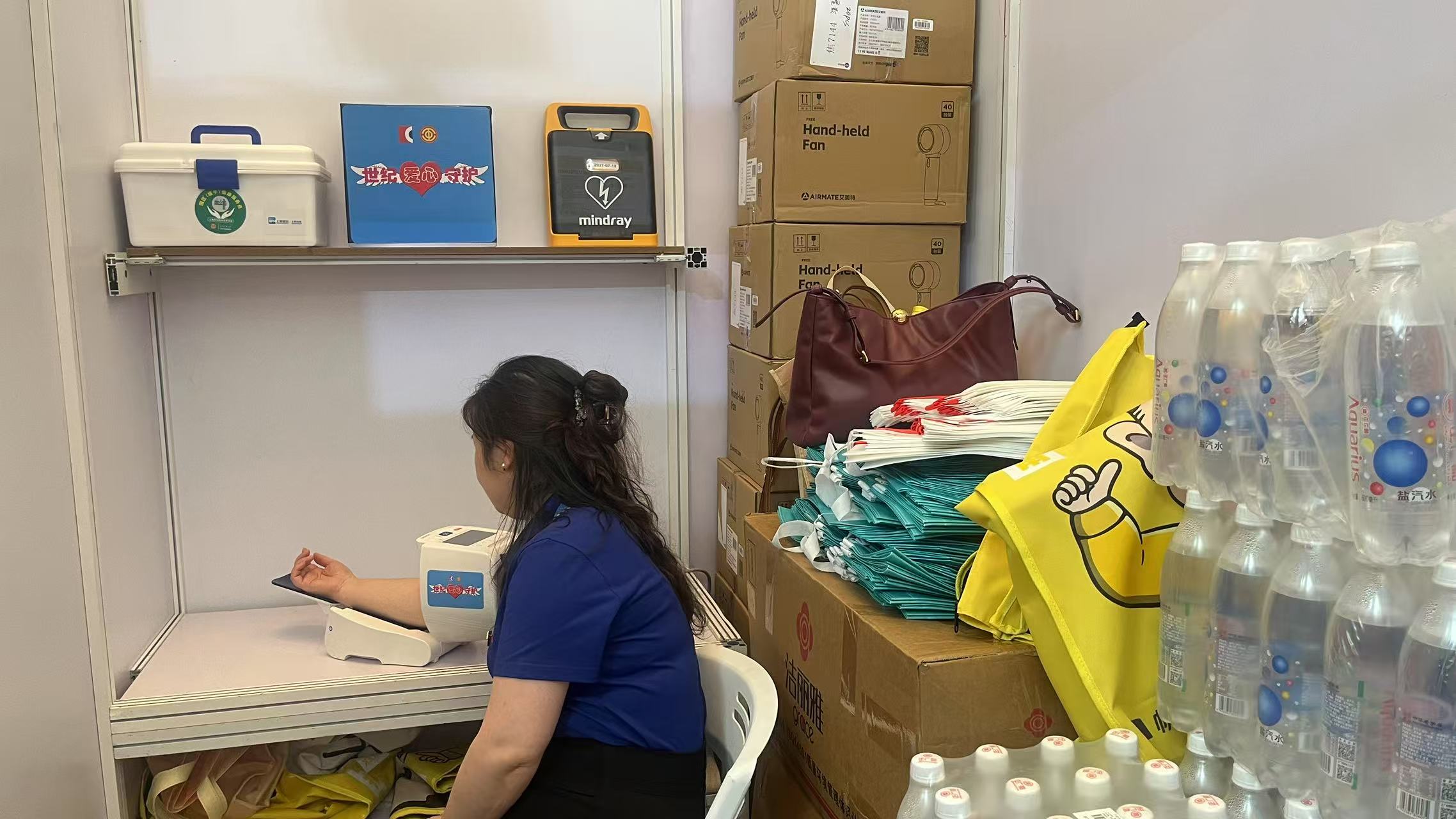 在现场,记者看到,职工服务点的挂牌清晰可见,现场提供五大服务,涵盖健康、应急、清凉、礼包等。在服务点内,血压计、体温计随时为职工提供健康监测,守护每一位参展人员的身体健康。工会精心准备AED自动体外除颤仪和急救药箱,内含创可贴、藿香正气水、硝酸甘油、麝香保心丸等常备药品,为突发状况提供及时援助。在职工服务点内,工会特别安排各个时间段的值班人员,从早到晚保证每时每刻都有人对接,职工有需求,服务点就会有响应。