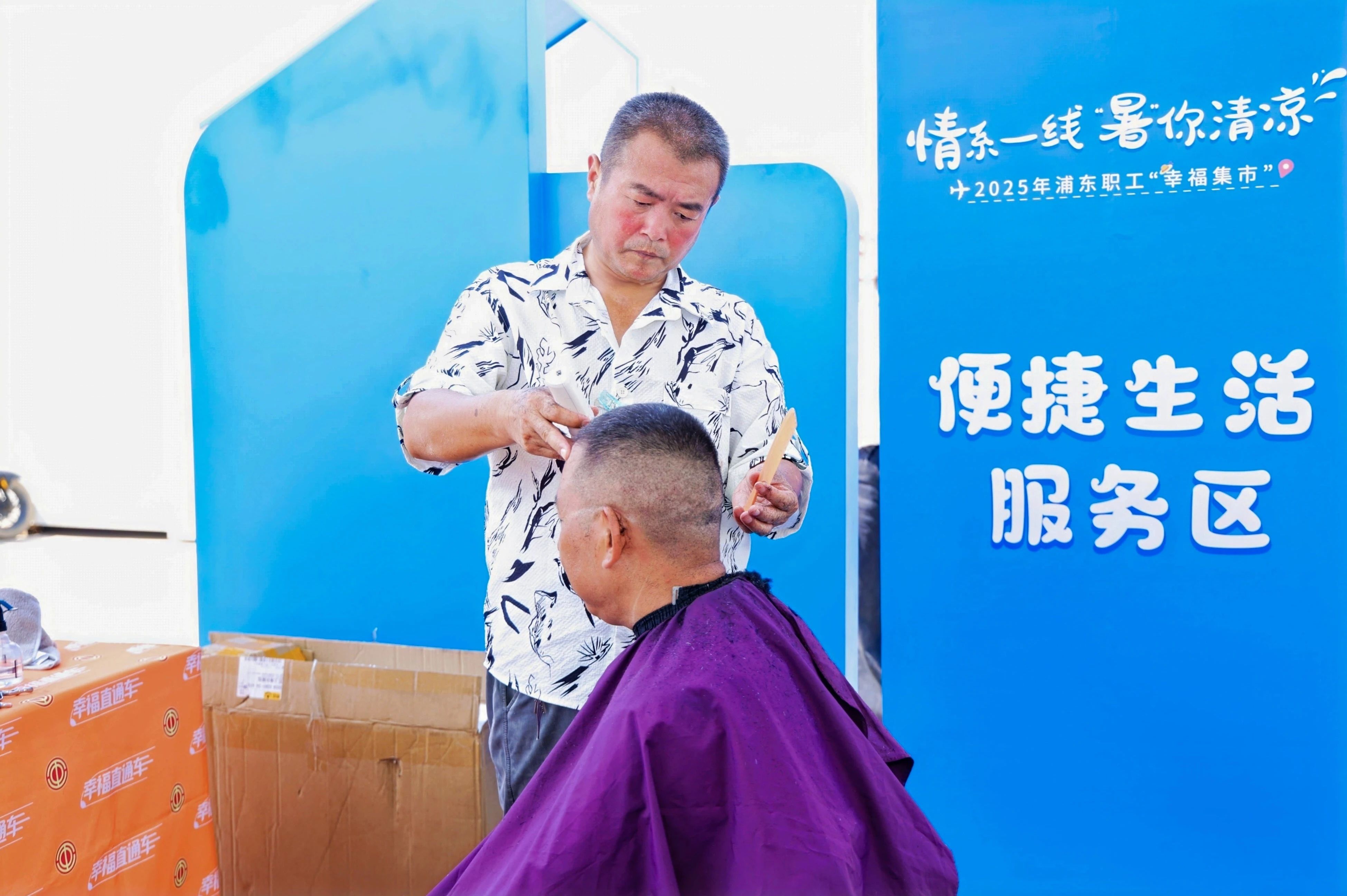 趣味游戏区赢取清凉饮品,服务区爱心义剪、口腔检查等一应俱全……在中建八局东方枢纽站前区A3-01项目工友村,工会给工人们送去了一份别样的夏日关怀。由浦东新区总工会主办的“情系一线 ‘暑’你清凉”——2025年浦东职工“幸福集市”上,集合了趣味互动、普法宣传、便捷服务与特惠好物,将清凉关怀与暖心服务精准送达奋战在高温一线的劳动者身边。