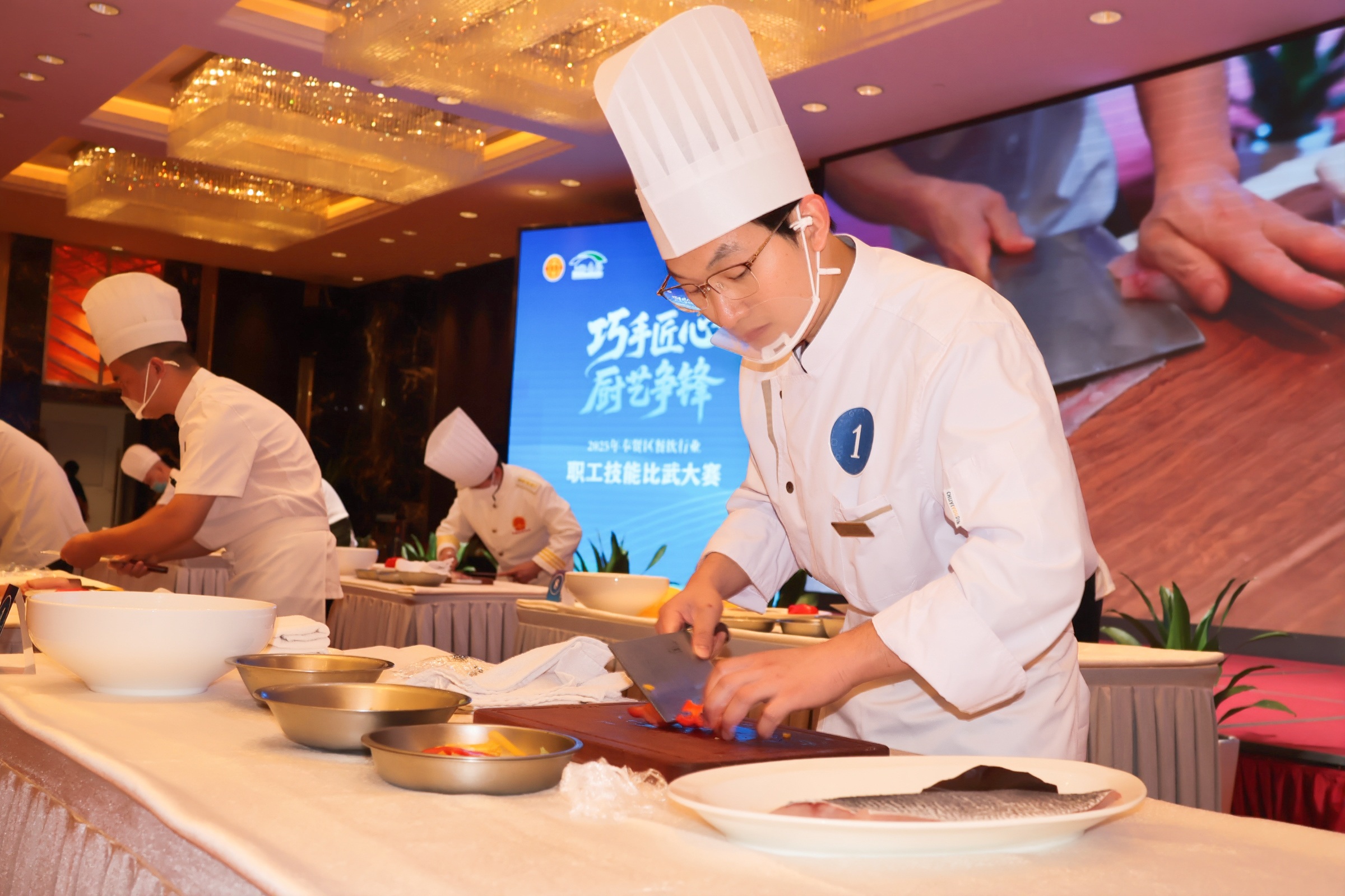 9月16日,悦华大酒店内热闹非凡,“巧手匠心・厨艺争锋”2025年奉贤区餐饮行业职工技能比武大赛在此举办。刀刃切菜的清脆声、食材香味交织,来自全区17家餐饮单位的选手身着工装,手持刀具全神贯注投入比赛,现场充满紧张又热烈的氛围。