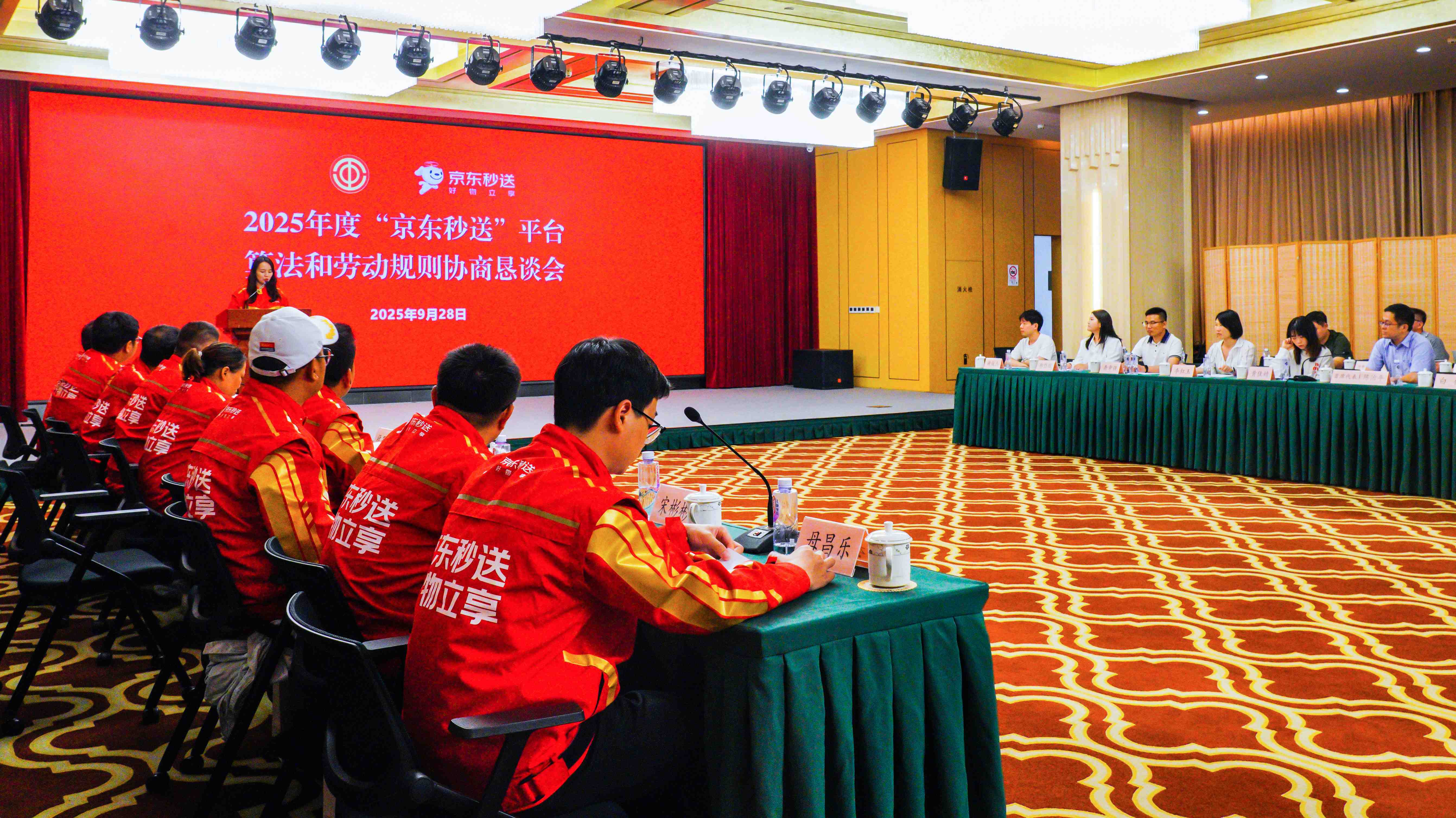 “一些大单、难单,是不是可以提一提补贴?”“我们全职骑手刚到京东秒送跑单,对APP不熟悉,心里没底。”“算法对我们来说太复杂了,配送费到底由哪几部分构成?”9月28日下午,在“京东秒送”平台算法和劳动规则协商恳谈会的现场,来自全国各地的骑手们和平台方代表围坐一堂,双方“打开天窗说亮话”,聊聊“算法背后劳动者的切身利益”——骑手们提出的劳动报酬公平性、休息休假、劳动保护、协商机制与算法透明度等内容,均得到平台回应。这些骑手们关切的内容,被写进了双方签订的《2025年度“京东秒送”平台算法和劳动规则协议》中,全国总工会权益保障部副部长王永华,中国财贸轻纺烟草工会副主席候选人、分党组成员郑又豪,上海市总工会党组成员、副主席赵德关,上海市杨浦区人大常委会副主任、区总工会主席董海明等现场见证了协议的签订。