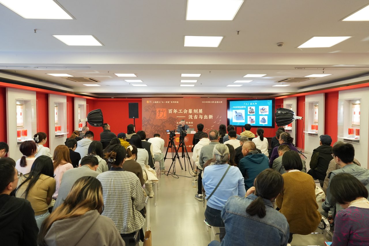 据活动主办方介绍,全国职工篆刻作品展·上海巡展由全国总工会指导、上海市总工会主办,上海市工人文化宫承办,以“永远跟党走 奋进新征程 建功新时代”为主题,通过“思想领航”“百年辉煌”“光耀申城”“群星璀璨”四大板块,精选400枚篆刻佳作,将诗书画印的艺术精髓与工运历史、城市记忆深度交融。展厅内,“百年工会号”巨轮装置尤为震撼,内环十印镌刻“竭诚服务职工群众”的时代使命,外环十印展现“汽轮发电机”等上海工业创举,三枚党的代表大会印章更彰显申城作为党的诞生地与工运发祥地的红色基因。此次“五一讲堂”是全国职工篆刻作品展·上海巡展推出的“展览+微导览讲座”模式的具体实践。