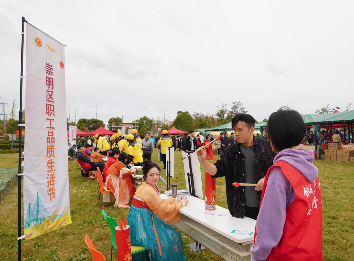 记者看到,职工品质生活节活动现场划分了六大主题区域。走进“舌尖崇明”美食荟萃区,浓郁的米香味扑鼻而来,职工争相品尝崇明糕等特色美食。在“匠心传承”非遗文化区以及创意工坊区,本地匠人正手把手教职工制作土布、鸭蛋彩绘、香囊等作品,感受非遗和民俗魅力。“品质生活”服务区吸引了不少趁着空闲时间赶来参加活动的外卖小哥,测量血压血糖,咨询互助保障计划,感受工会的关心与关爱。在美服体验区和“丰收喜悦”互动娱乐区,职工不仅可以穿上汉服打卡拍照,还可以参与定点打靶、盲摸猜百果、丰收知识问答等小游戏。值得一提的是,职工参与游戏并集满三个章,就可以兑换购物券,选购包含生鲜、速食食品、化妆品、工艺品等在内,具有崇明特色的产品。“我们今天带来了将近400斤沙乌头猪肉,这是崇明本土品种,肉质肥而不腻,简单烹煮便满屋飘香。”实惠的价格,上乘的品质,令沙乌头猪肉摊位在当天颇具人气。上海沙乌头农业科技有限公司副经理施东源告诉记者,猪肉都是早上新鲜屠宰的,并全程冷链运到现场售卖,不到一个小时便被抢购一空。