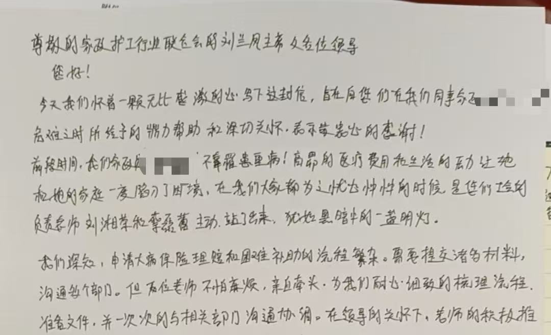 “有了工会组织的拥抱,让我们这些漂泊在异乡的姐妹,真真切切感受到家的温暖。”不久前,宝山区家政护工行业工会收到了一封手写的感谢信。普通的A4纸上,写满了刘晓梅(化名)的感激。对于她的一家来说,2025年这一年,接连而来的重病、手术和经济压力,让生活一度变得沉重;所幸,在最困难的阶段,有一双双“看得见的手”,始终在身后托着他们。
