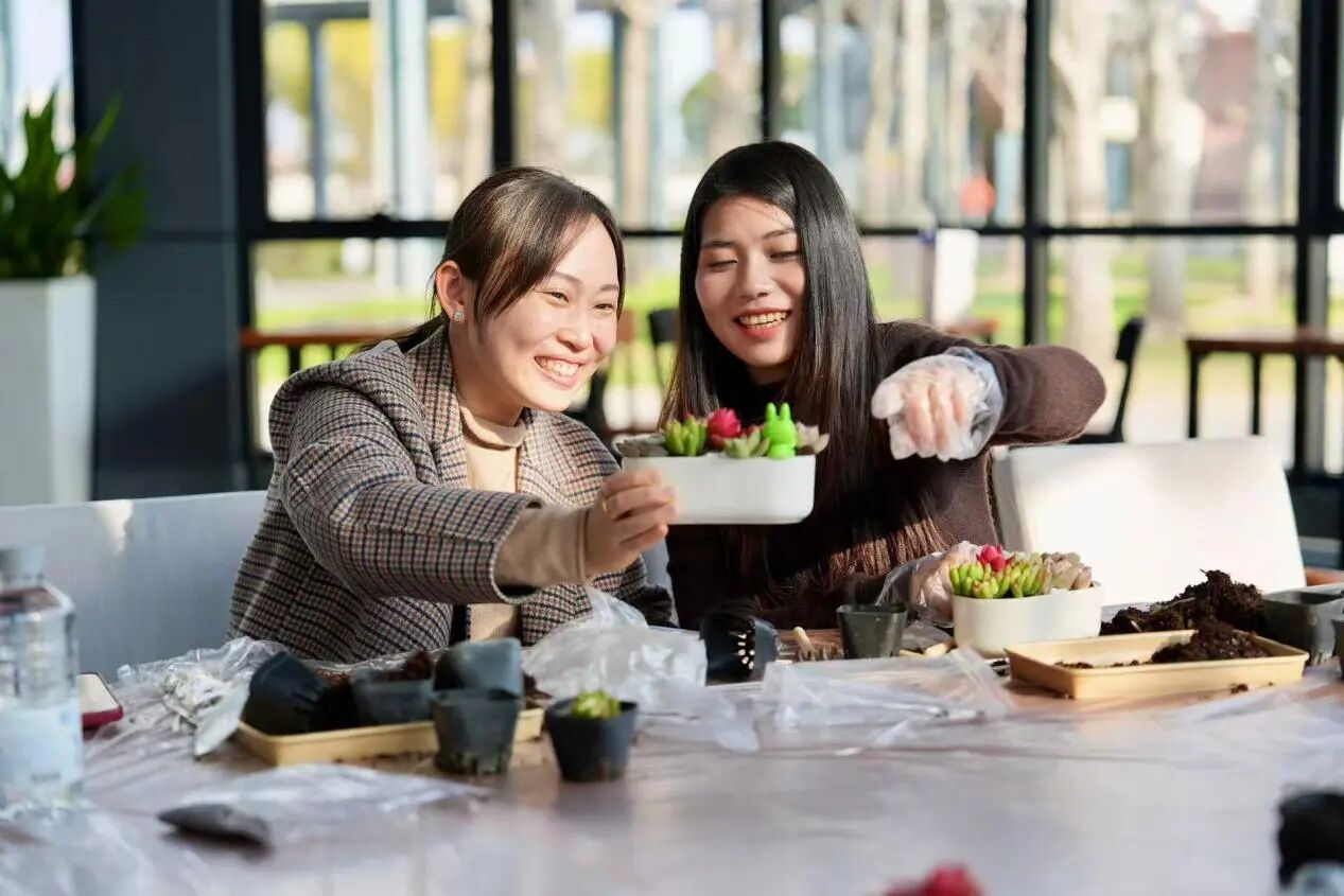 在交运智慧湾(北上海银发经济产业园),“多肉微景盆栽DIY”活动同样人气十足。职工们挑选植株、搭配造型,在绿意与巧思中感受慢下来、静下来的工闲时光。街区商户联合工会和上海智航大厦工会联合会组织的“微景观生态瓶制作”活动,则通过跨企业参与,搭建起职工交流的平台,进一步增强了街区凝聚力。