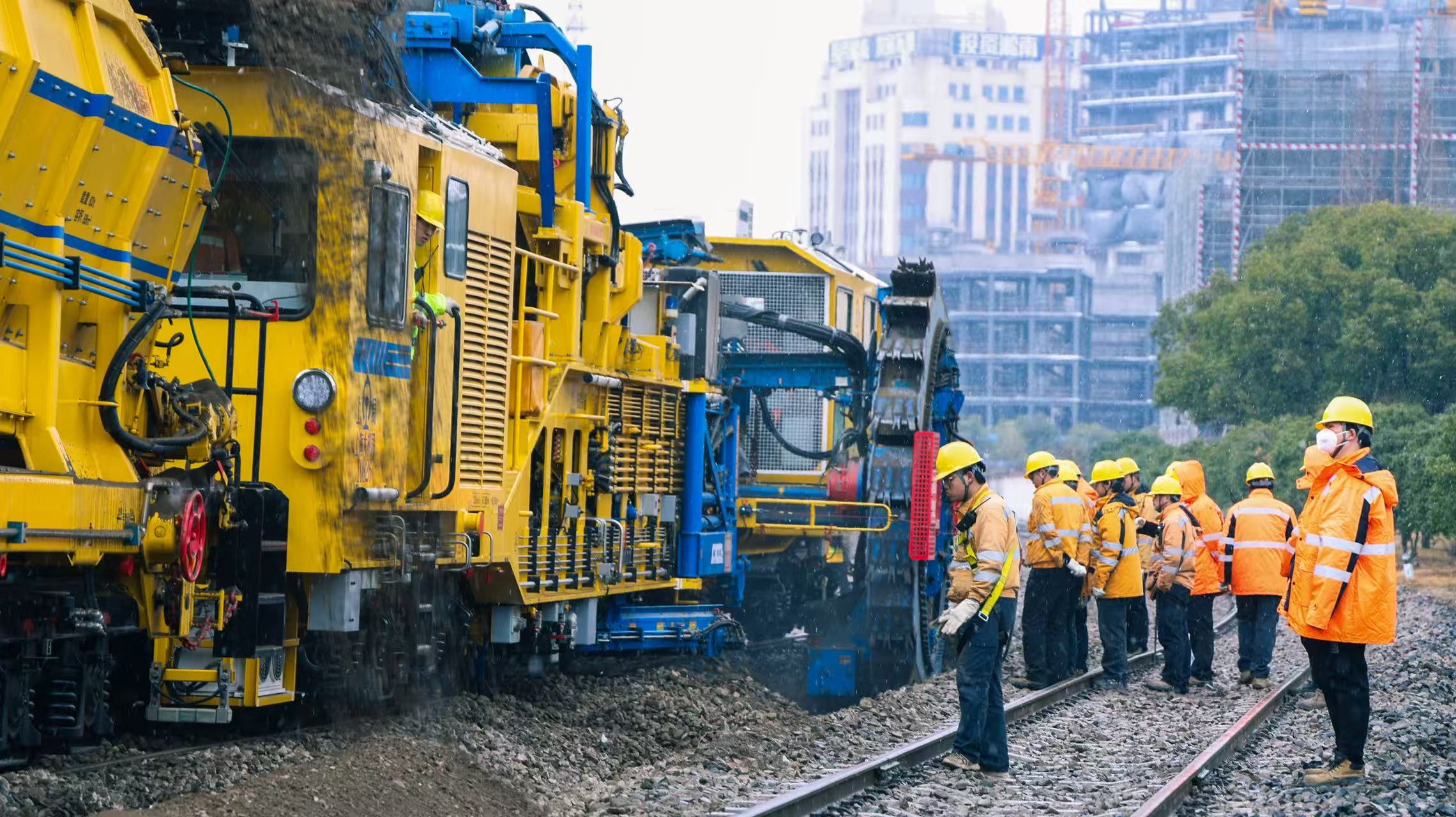 在上海何家湾基地,上海大机运用检修段大修车间岔清工班正在进行基27、基28两股道的清筛落道作业。面对寒潮低温与雨雪天的双重考验,班组人员以清除道床杂物、优化排水性能、提升线路平顺性为目标,连续奋战作业,按时保质保量完成两股道的清筛落道任务。