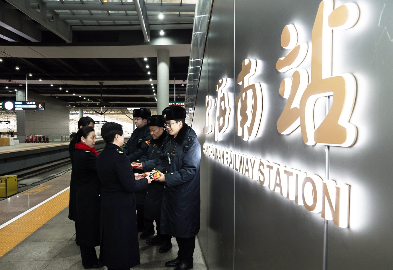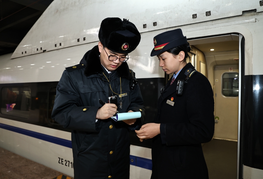 在铁路上海南站,伴随着随风飘荡的毛毛雪,新入路的客运员朱文韬在站台上有序组织旅客乘降。此时,正值G1614次列车上客,他闪动在拥挤的站台,不断提醒旅客雨雪天气路滑,注意脚下安全。与此同时,1991年参加工作的“老铁路”宋海徽亦在同一个站台上,“眼观六路、耳听八方”保障旅客安全、快速上车。他告诉记者,大家沉醉在下雪浪漫之中时,铁路人心中却捏了一把汗。因为雨雪天气有可能会导致列车晚点甚至停运,影响旅客的出行。“为了列车准点发出,载着旅客去往下一站,我们铁路人义不容辞迎战风雪。”