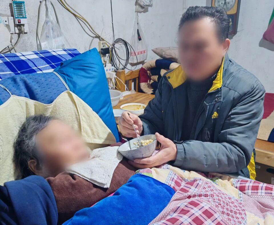 提起王大哥,邻里乡亲无不称赞,他是村里公认的孝子。2024年5月,一场突如其来的意外打破了这个家庭的平静——88岁的母亲突发脑梗,不慎摔倒,虽经全力救治捡回性命,却落下了严重的后遗症,从此瘫卧在床,生活完全无法自理。更让人心疼的是,受脑梗影响,加之年事已高,母亲时常神志不清,有时甚至认不出日夜照料自己的儿子,发脾气、不配合护理更是家常便饭。即便如此,王大哥始终不离不弃,用耐心与坚守诠释着孝道:“妈妈病了,她不认识我不要紧,不管怎么样我都是她的儿子!”