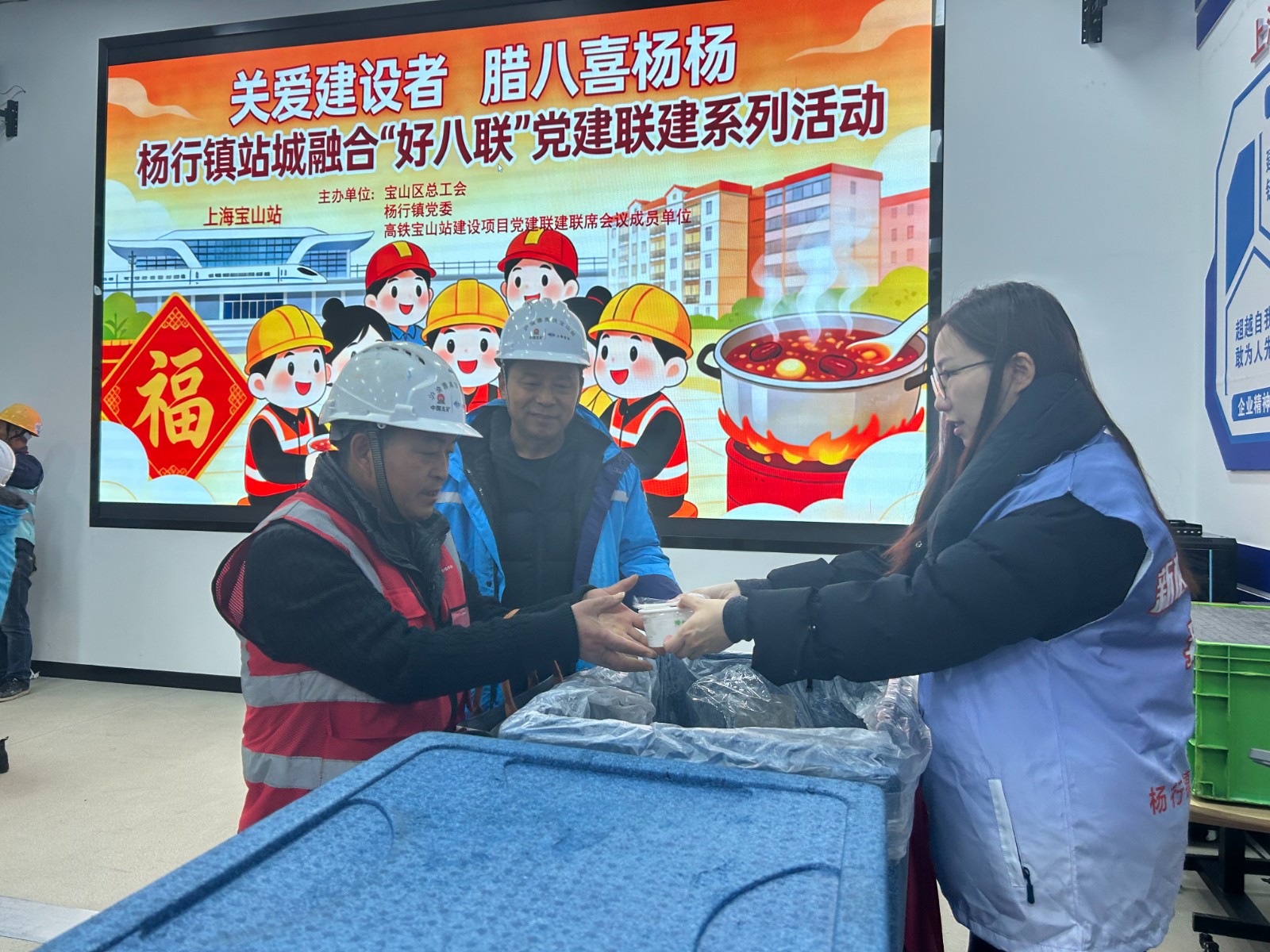 今年腊八,上海细雨轻落。1月26日上午,宝山区总工会联合杨行镇总工会和高铁宝山站建设企业工会,开展腊八节关爱户外劳动者主题活动,为奋战在一线的建设工人和城市运行保障人员送上又一份温暖。