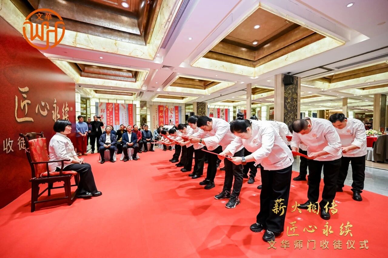 行拜师礼、敬拜师茶,近日,大国工匠、上海市现代食品职业技能培训中心首席技师干文华收徒拜师仪式举行,二十名烘焙行业优秀技术人员正式拜入干文华门下,其中包含8位全国技术能手,他们皆是行业内深耕技艺、追求极致的中坚力量,怀揣着对烘焙匠艺的赤诚与敬畏,愿以躬身求教之姿,承大师之技,传匠人之心。