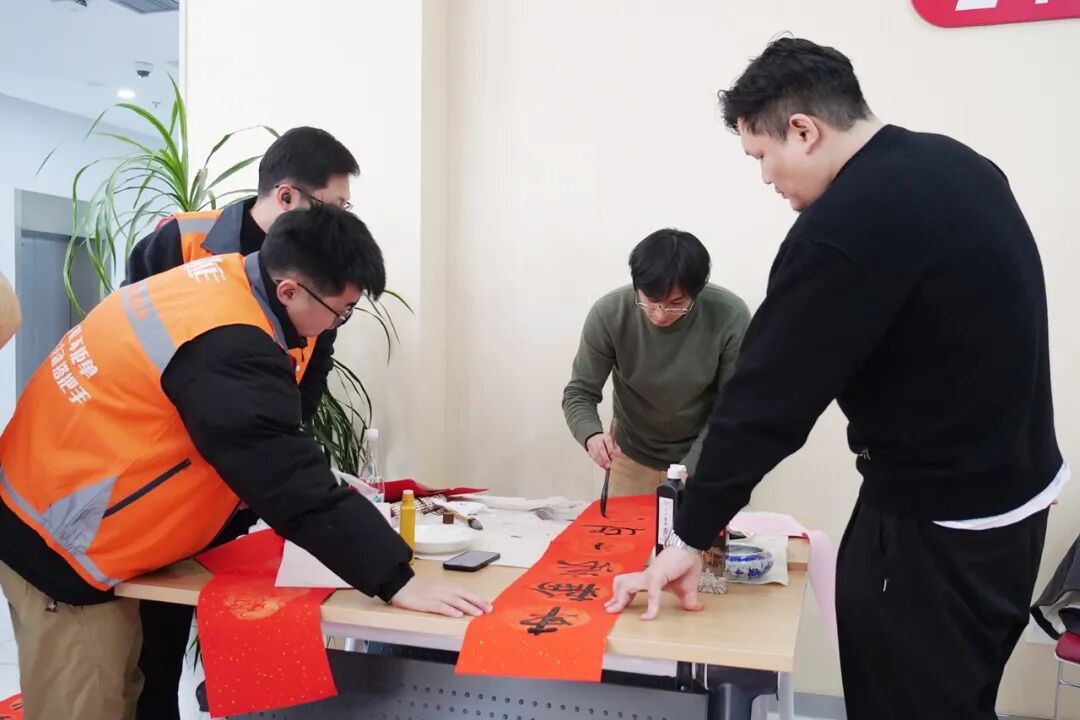 活动现场,区总工会精心准备了法律咨询、互助保障咨询、手写春联、手机贴膜、理发等多项暖心公益服务,吸引了众多新就业形态劳动者前来参与。每个摊位前都排起了队伍,欢声笑语中洋溢着节前的喜庆氛围。“老师,请帮我写个‘出入平安’的横批吧!”“我想要个带‘福’字的!”手写春联区,劳动者们围在桌旁,认真挑选着自己心仪的联句。几张长桌一字排开,红纸铺展,墨香四溢。书法老师挥毫泼墨,笔走龙蛇,一副副充满吉祥寓意的春联在他们笔下诞生。“好多年没贴手写春联了,这种传统年味是印刷品比不了的。”一位小哥捧着墨迹还未干的对联开心地说道。