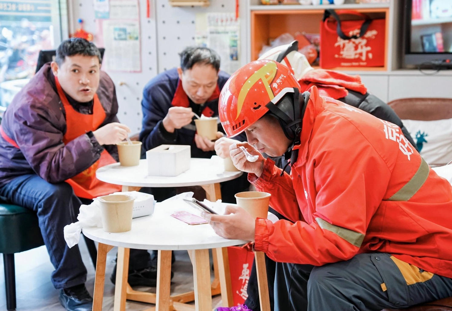 下午2点,小哥驿站分会场错峰启动,包元宵、品元宵、猜灯谜三大环节同步开启,掀起一波又一波欢乐热潮。在包元宵体验区,师傅现场示范,骑手小哥纷纷戴上围裙、手套,跟着教程揉糯米团、包馅料,一个个形态各异的元宵在大家手中诞生,现场充满了欢声笑语。猜灯谜区更是热闹非凡,红灯笼下挂满了涵盖安全知识、民俗常识、工会政策的灯谜,小哥们驻足思索、互相探讨。