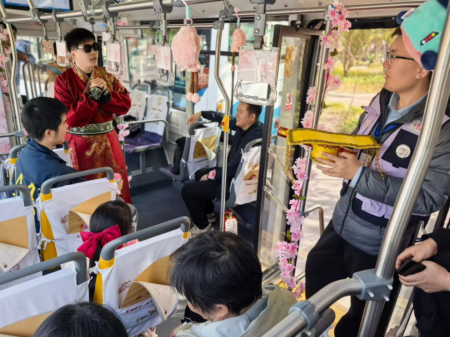 “欢迎各位搭乘大糖樱途专线,我是本趟樱途专线的主理人,大家也可以叫我樱花使者阿哲。”在今年的樱花巴士上,由杨高公交职工扮演的NPC成为了车厢里夺目的存在。作为今年樱花巴士的最大亮点线路,“大糖樱途”专线以“公交=剧情推进器”为核心理念,打造一站一景的实景互动体验。线路从洲海路地铁站1号口始发,乘客上车即化身“剧情主角”——每位乘客将随机抽取任务卡,由主理人全程陪同引导,还有NPC在樱花市集、高东生态园等点位推进任务。游客完成任务的同时,可深度游览高东樱花美景,体验“秘境寻踪”的乐趣。