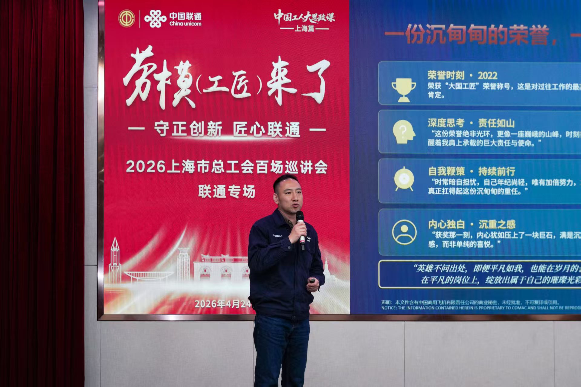当天,中国联通上海市分公司还举行了“十四五”期间涌现的劳模先进集体和个人红毯仪式,发布了公司荣誉体系及2026年荣誉奖项,启动了上海工会夜校联通教学点,并为“上海联通职工大讲堂”揭牌,以多元活动厚植劳模文化、凝聚奋进力量。