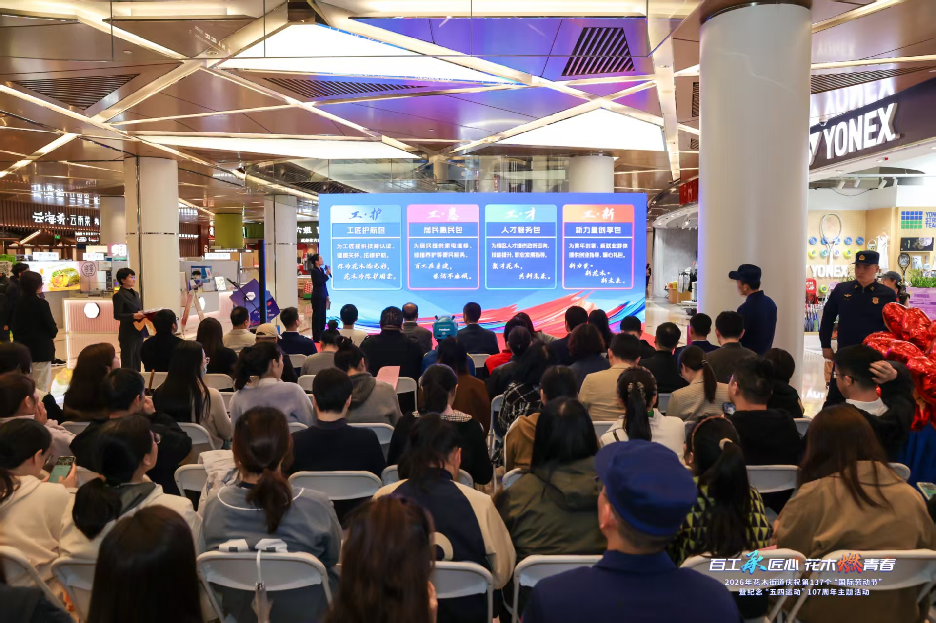 4月29日,丁香国际商业中心一楼外场,由花木街道党工委主办、花木街道总工会、团工委承办“百工承匠心 花木燃青春”——2026年花木街道庆祝第137个“国际劳动节”暨纪念“五四运动”107周年主题活动举行。10位来自不同行业的“百工匠星推荐官”登台亮相,涵盖四大板块的“百工匠心服务包”正式上线,标志着花木街道以工匠精神赋能人才服务、商圈经济与社区安全的全新探索拉开序幕。