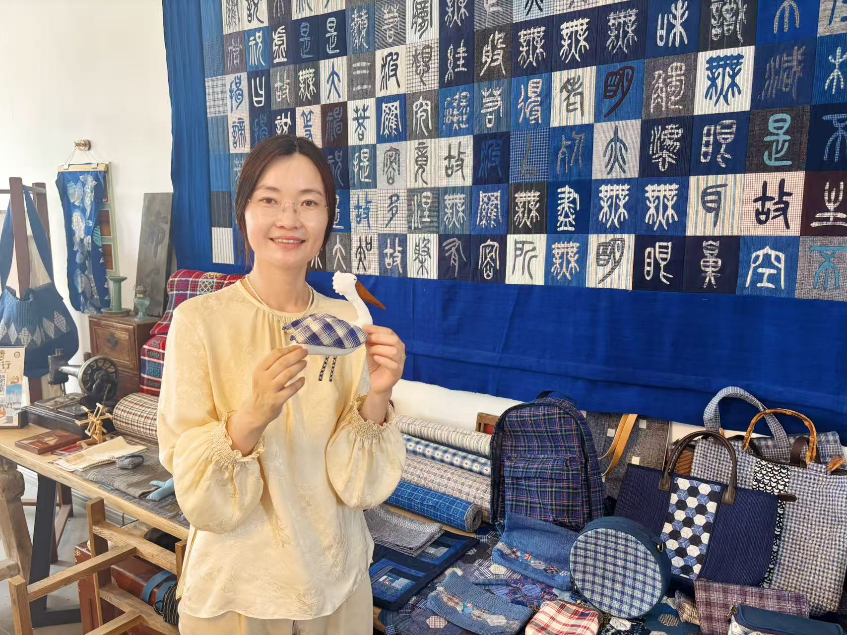 而在下方的工作展陈台上,放置了诸如包包、玩偶、摆件等以土布为原材料所制成的用品。经由文创设计后,使得传统土布焕发新生。