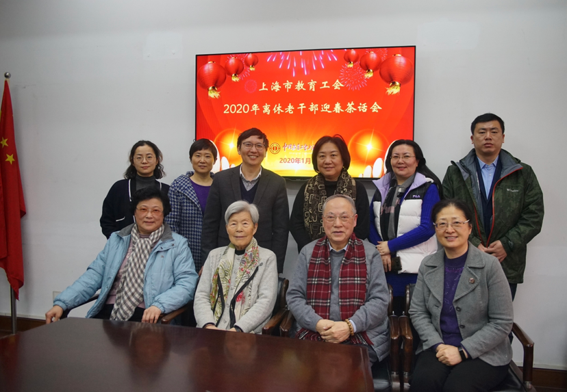 上海市教育工会2020年迎春茶话会上,历任主席与工会干部合影留念