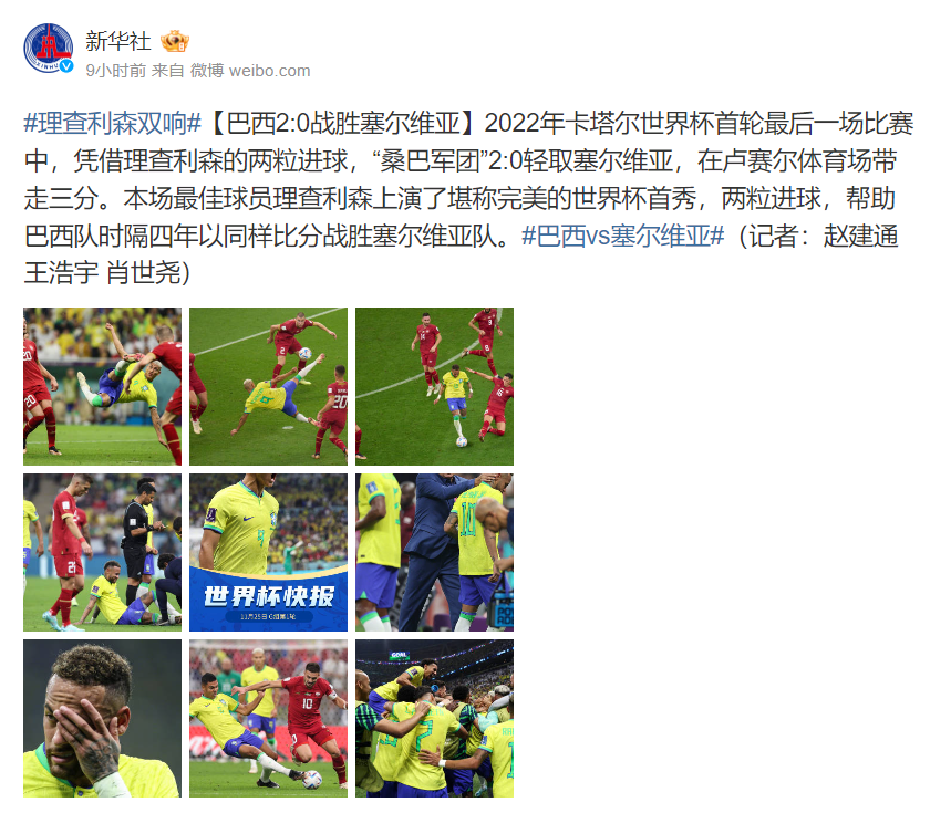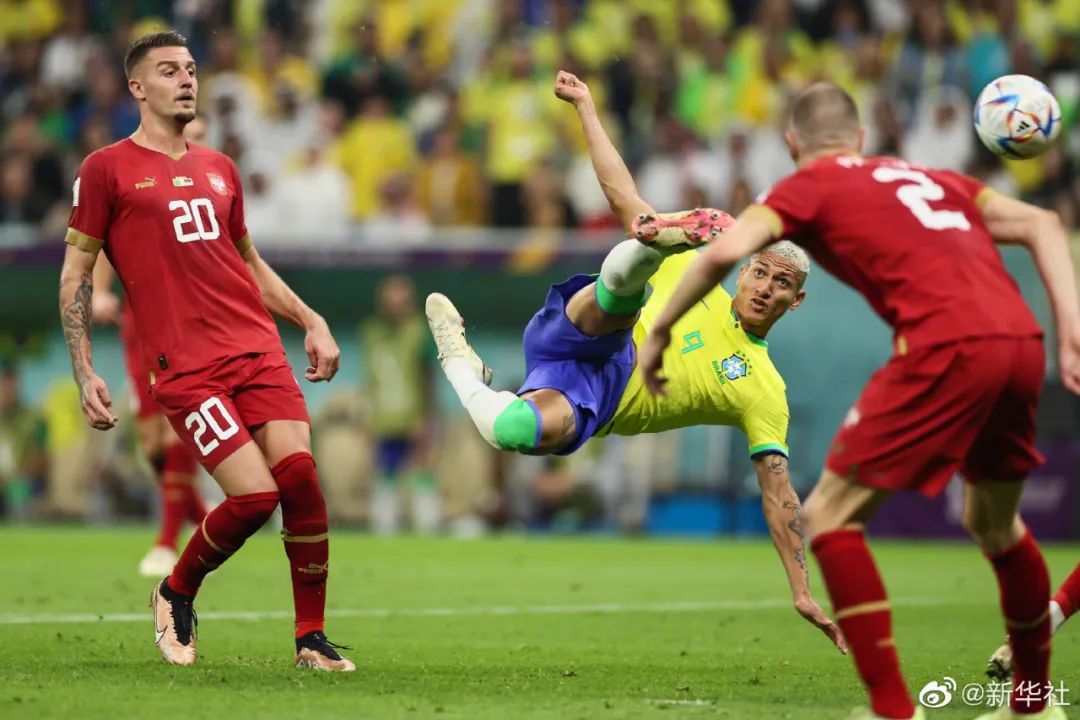 在本届卡塔尔世界杯巴西对阵塞尔维亚的比赛中,巴西球员理查利森在接到队友的传球后,一跃而起,顺势一脚倒钩射门直接将球送入塞尔维亚球门,贡献了一粒精彩进球!