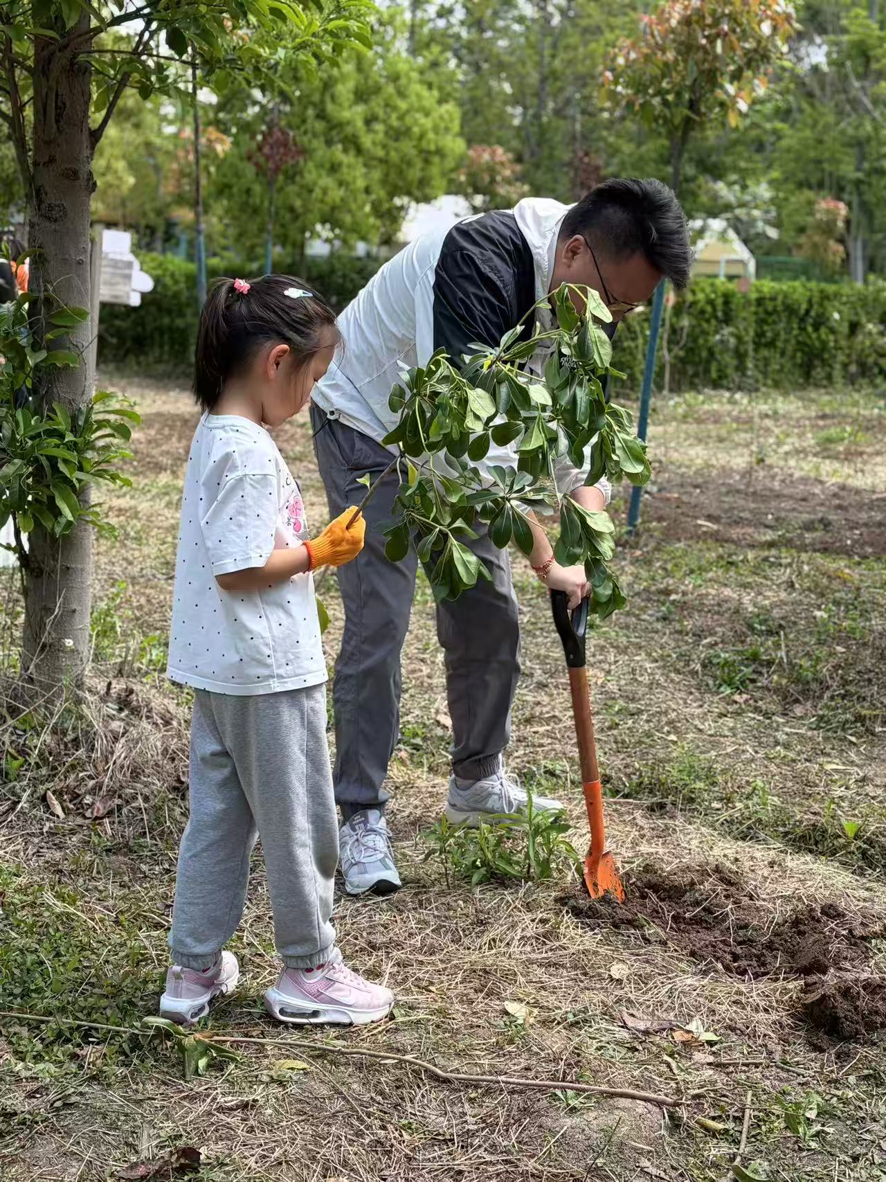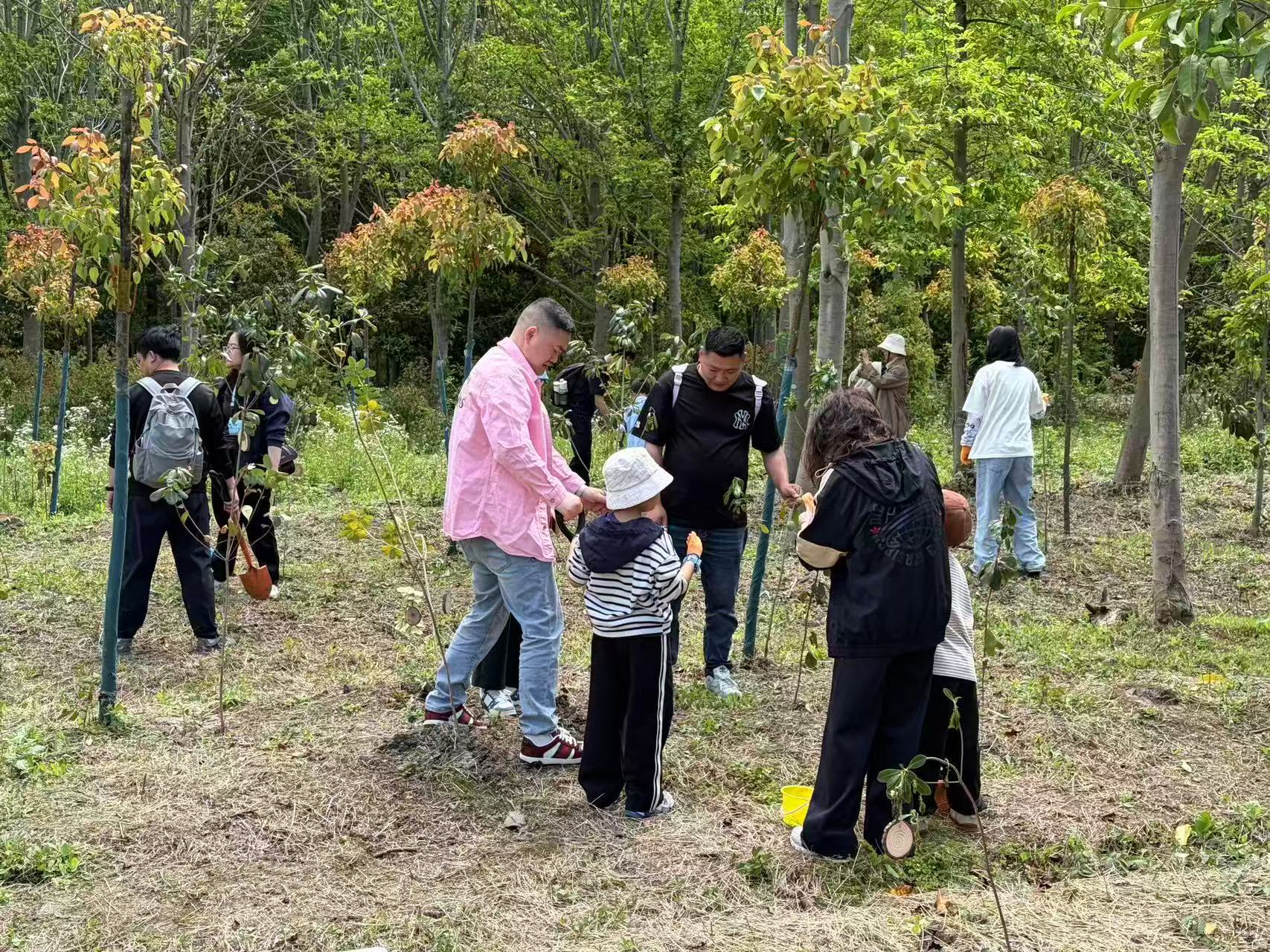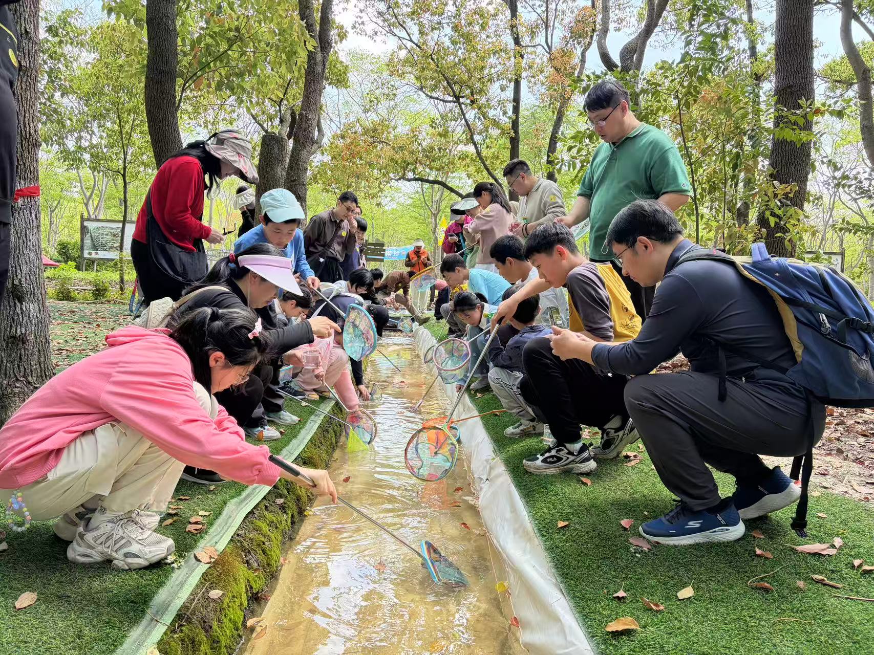 活动现场,草木葱茏、溪水潺潺,提供了极佳的体验场景。上午的植树环节,学生和家长分工协作、干劲十足,挖坑、植苗、培土、浇水、挂上亲手绘制的树牌,“小记者”们化身“绿色守护者”,为大地增添新绿。随后的森林亲子律动操,锻炼着大家的协调性,欢乐氛围点燃全场。