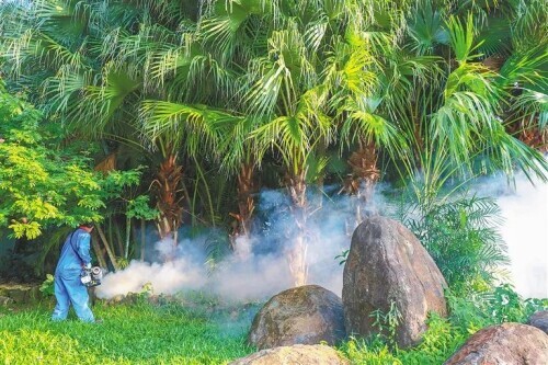 海口市人民公园内专业消杀队员深入绿化区域开展消杀工作。 海南日报记者 李天平 摄