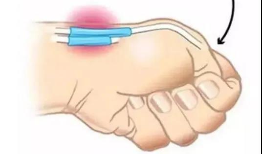 推荐一个动作自测腱鞘炎:将拇指握于掌心,然后使腕关节被动尺偏(往小拇指处使劲),如引起桡骨茎突处(大拇指这一侧的手腕)明显疼痛,就表明可能存在桡骨茎突狭窄性腱鞘炎。