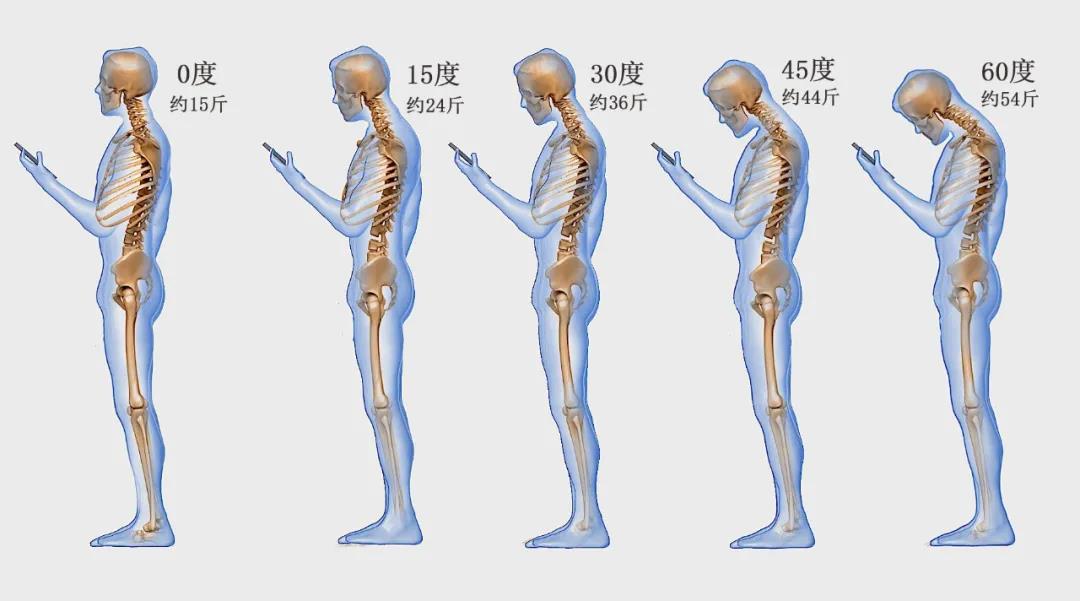 而玩手机时,低头角度约为60度,颈椎间盘承受的压力达27公斤,相当于一个7岁儿童的体重。