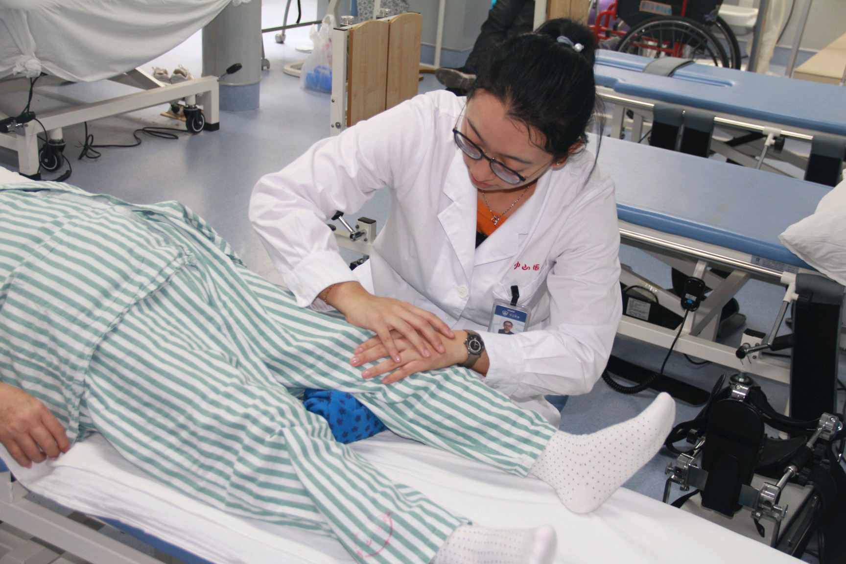 对于体力及肌力较弱的患者,康复治疗师会指导床上四肢运动,包括使用沙袋、下肢训练器等,提高患者的肌力和耐力。