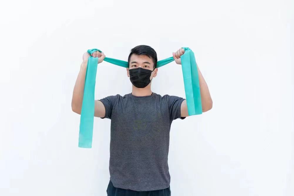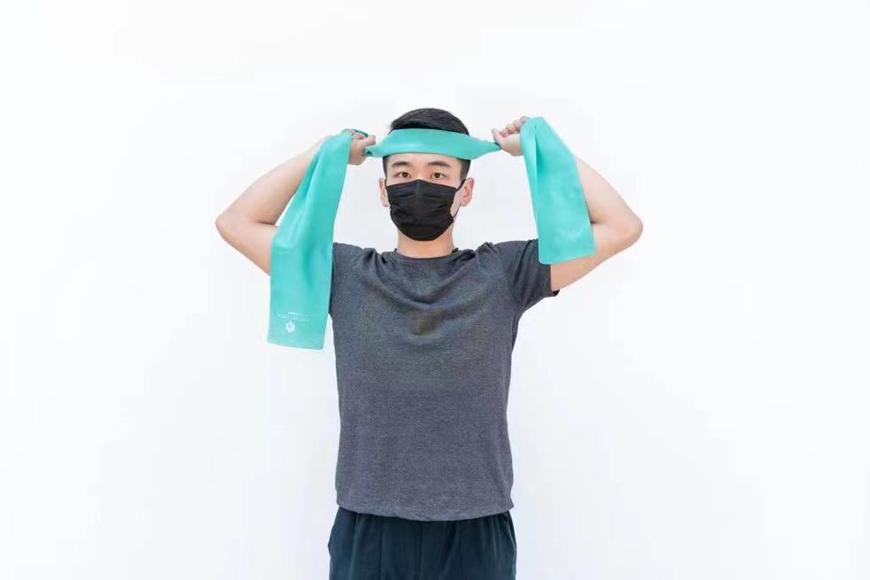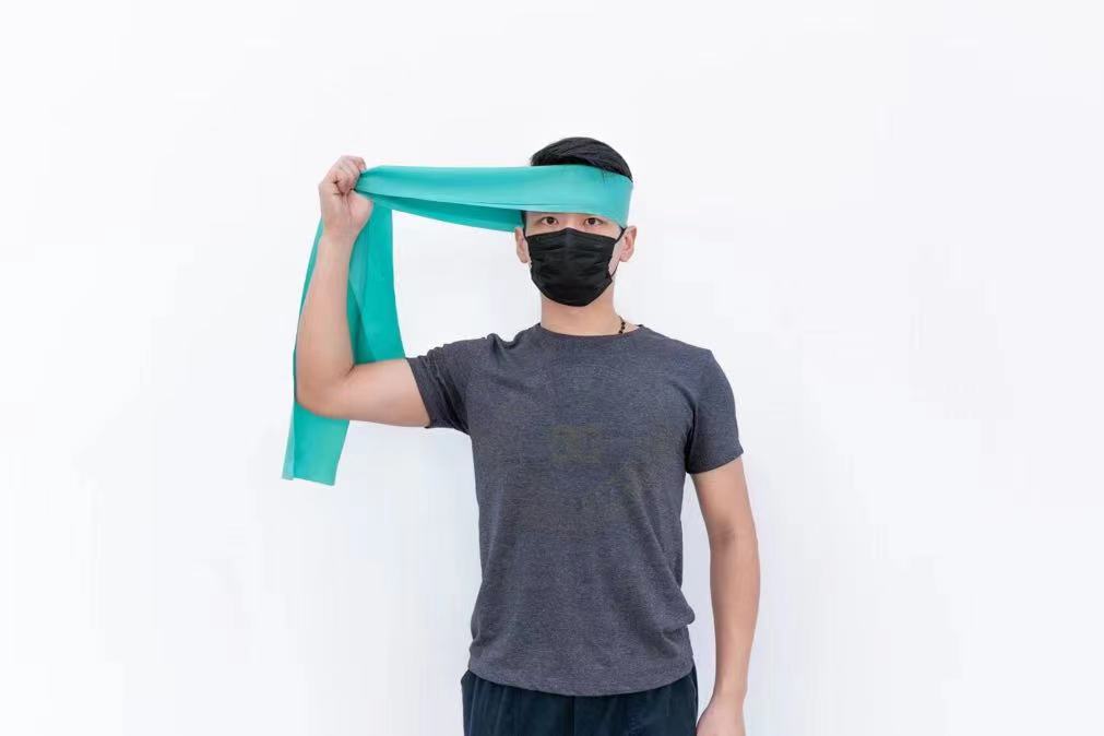 将弹力带对折,将弹力带绕过左耳上方,左手自然放松,右手拉住弹力带,留出合适距离,向右侧拉开,同时头部向左侧对抗拉力,注意头颈部保持基本不动,拉力带保持与地面平行,感受颈部肌肉左侧肌肉的收缩,以合适的拉力保持10秒后休息。