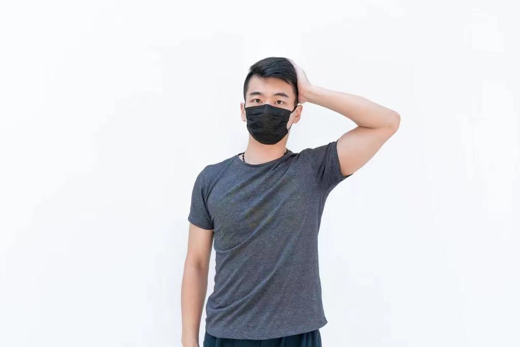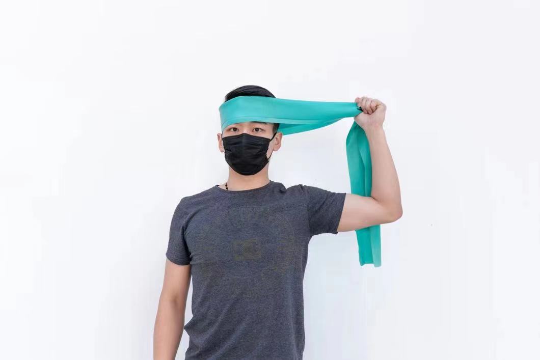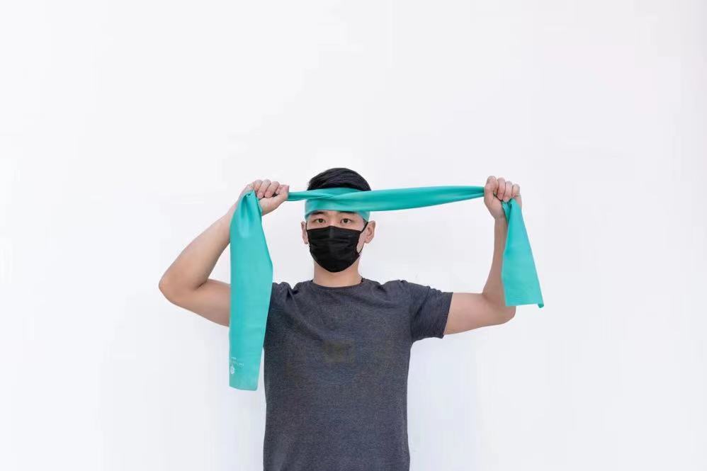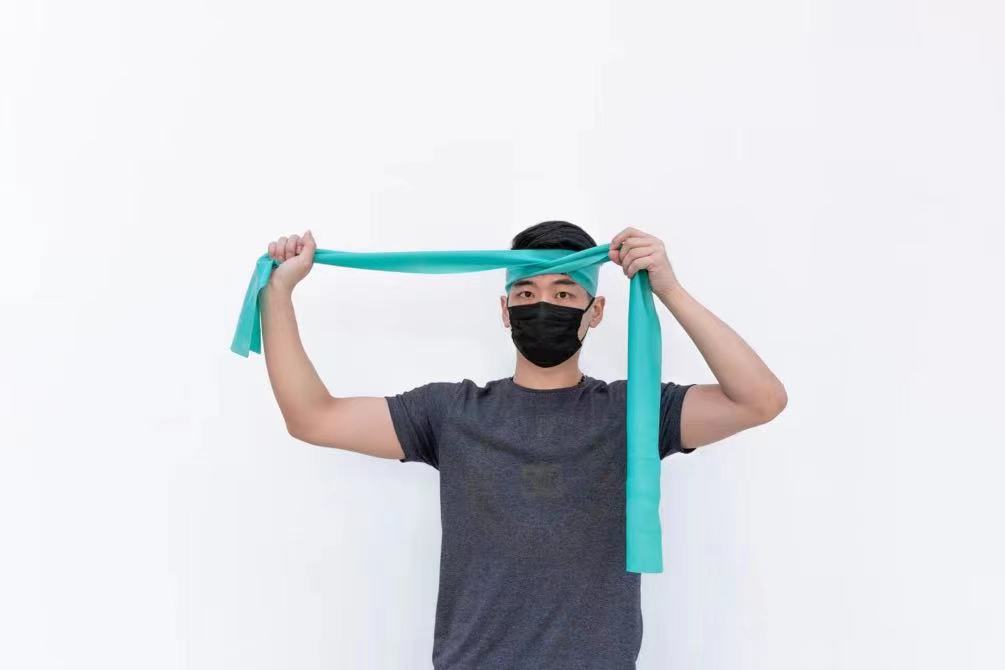 将弹力带对折,从枕后(后脑勺)绕头一圈至前额交叉,左手不动,右手向右前侧拉开,同时头向左侧旋转对抗拉力,注意保持头颈保持基本不动,感受颈部肌肉(主要是胸锁乳突肌)收缩,以合适的拉力保持10秒后休息。