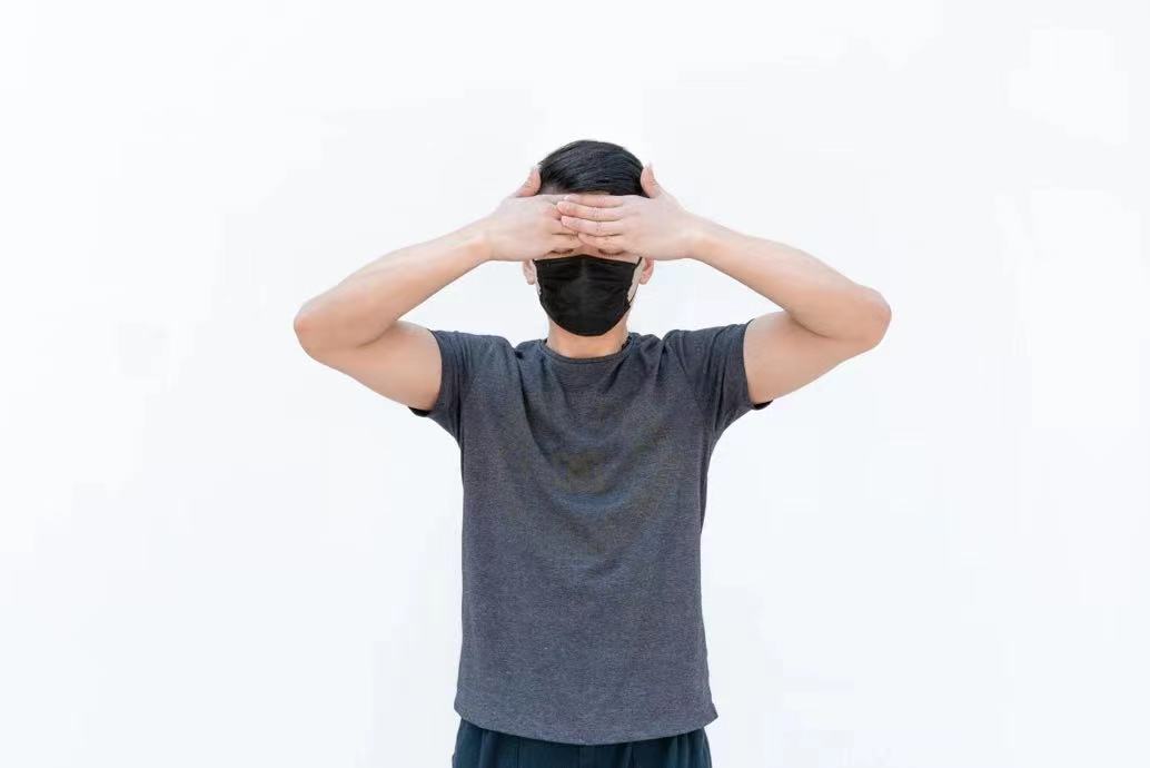双手置于前额,向后按压,同时头部向前用力对抗双手压力,同样注意头部和颈部都保持基本不动,感受颈部肌肉(主要是前侧肌肉)的收缩,保持10秒后休息;同样,将双手置于枕部,向前用力按压,同时头后仰对抗,保持头颈部基本不动,感受颈部肌肉(主要是后侧肌肉)的收缩,保持10秒后休息。