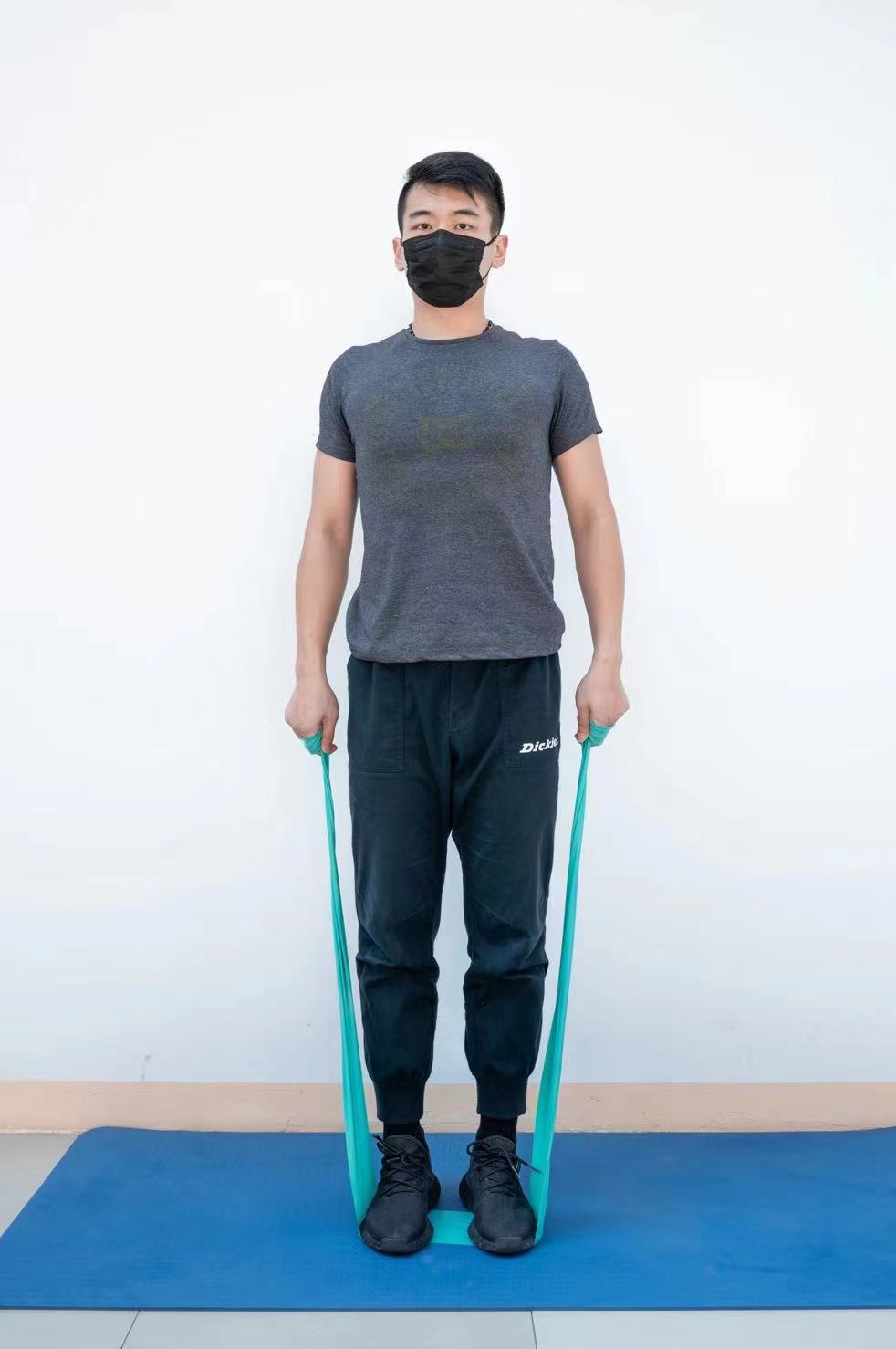 双脚将弹力带中段踩住固定,双手握住弹力带两端,调整长度,绕腕一圈固定,耸肩并感受颈肩部肌肉收缩(主要是斜方肌),如果觉得张力不够可以将弹力带继续绕腕几圈调节,以合适的拉力保持10秒后休息。