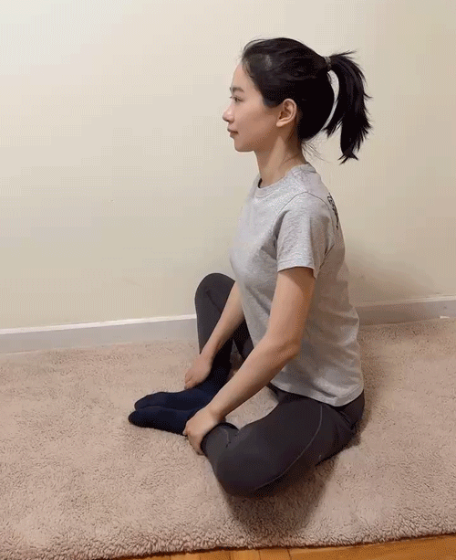 双膝弯曲、屈腿端坐在健身垫上,背部挺直目视前方,双手握住踝关节;俯身向前,将上身慢慢下压,同时双膝向外分开,胸部向双脚靠近,感受大腿内侧有酸痛和拉伸感;保持此姿势30秒,然后放松,回到起始位置。