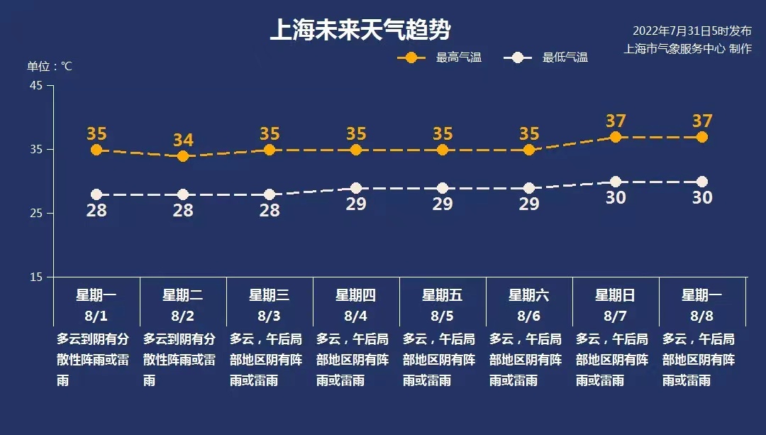 8月1日,周一:多云到阴有分散性阵雨或雷雨 28-35 ℃