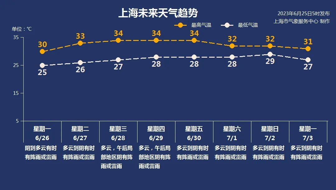 本周,上海多阵雨或雷雨天气。周中,上海处在副热带高压边缘,午后雷阵雨天气较多。气温逐步回升,预计周三至周五最高气温接近高温线,在34℃附近,气温高,湿度大,届时体感会变得非常潮湿闷热。