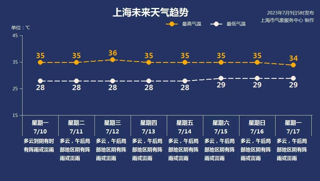 7月10日,周一:多云到阴有时有阵雨或雷雨 28-35℃
