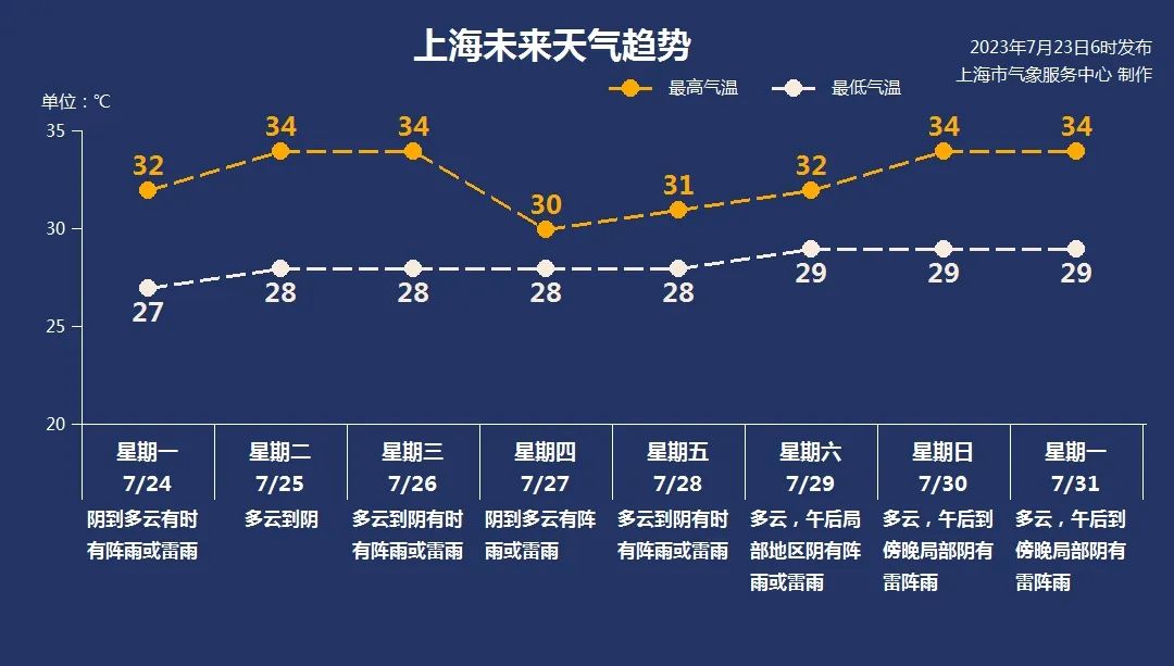 7月24日,周一:阴到多云有时有阵雨或雷雨 27-32℃