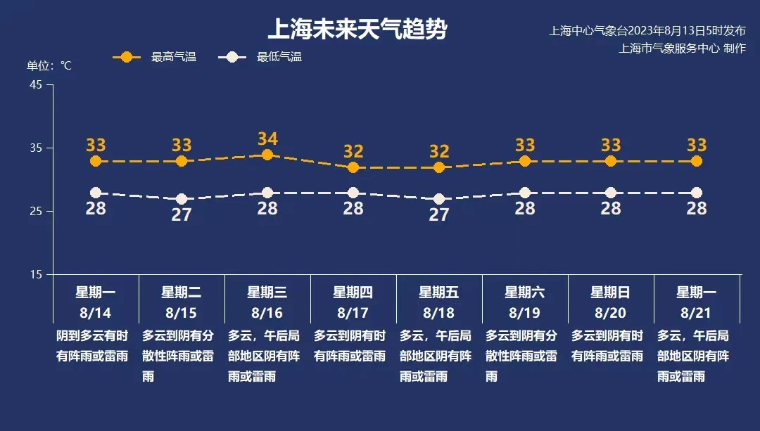8月14日,周一:阴到多云有时有阵雨或雷雨 28-33℃
