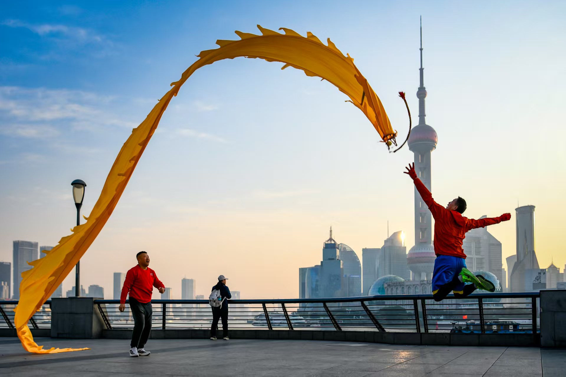 伴着晨曦,龙腾外滩舞龙队的阿姨爷叔们总会准时来到外滩观景平台晨练。在“陆家嘴三件套”轮廓的衬托下,他们手中的绸缎龙身在跳跃抛接之间,舞得活灵活现。