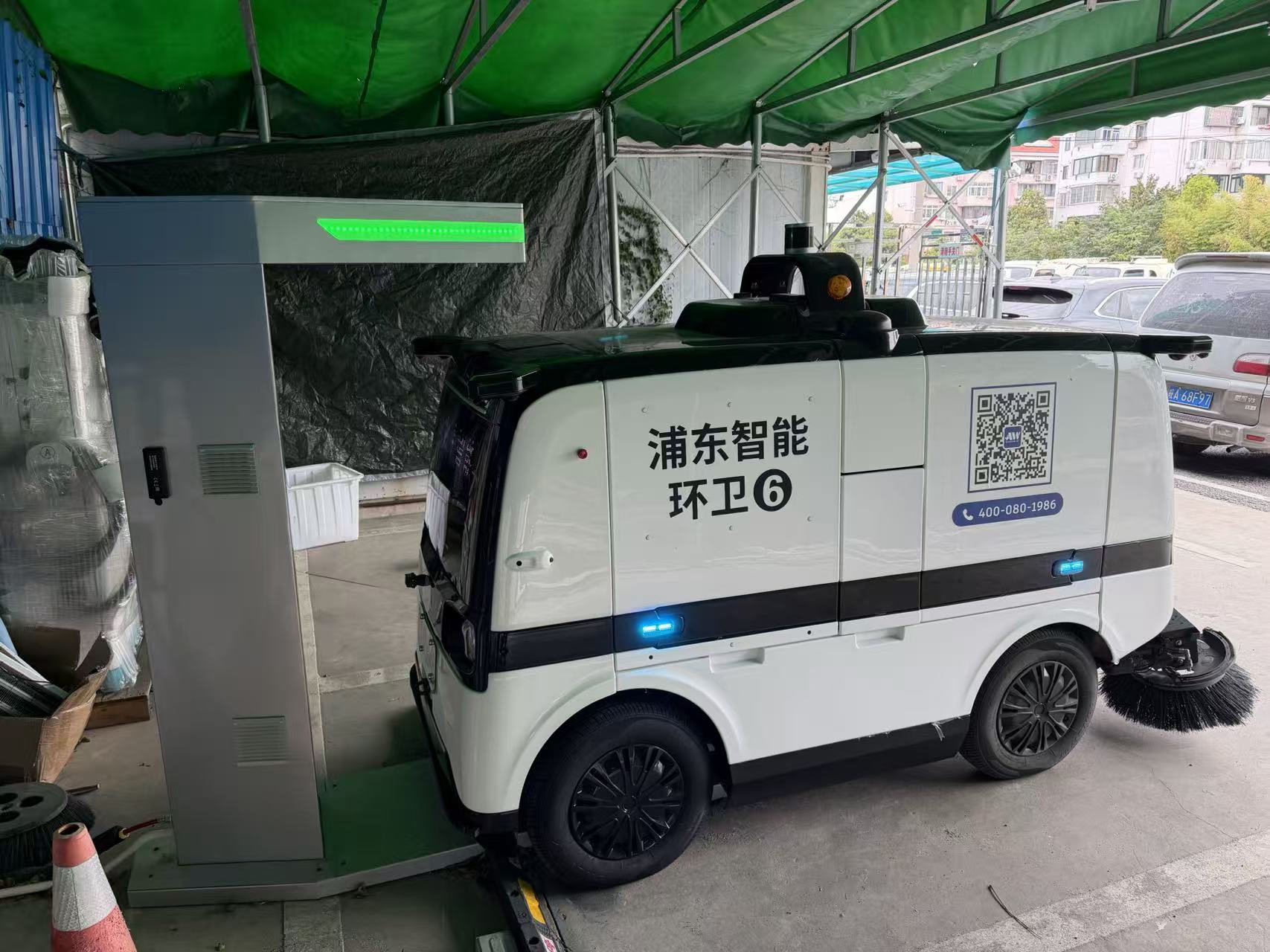 无人扫地车在自我充电、加水。劳动报记者 贡俊祺 摄影