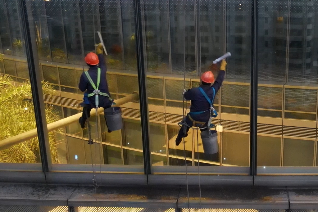 6时18分,天空露出些许蓝色。班组里的“小年轻”邢义法戴上安全帽,穿上五点式安全带,从21层设备层翻出,坐上摇摇晃晃的吊板,开始清洗作业:先用抹水器蘸上清洁剂,均匀地涂在玻璃上,然后用刮板将脏水刮净,最后将边框擦干净,如此循环往复,动作行云流水,十分丝滑。“我们2个人负责3块玻璃的清洁,但手臂长度有限,因此需要不断左右晃动身体,像‘荡秋千’一样来回擦拭。”