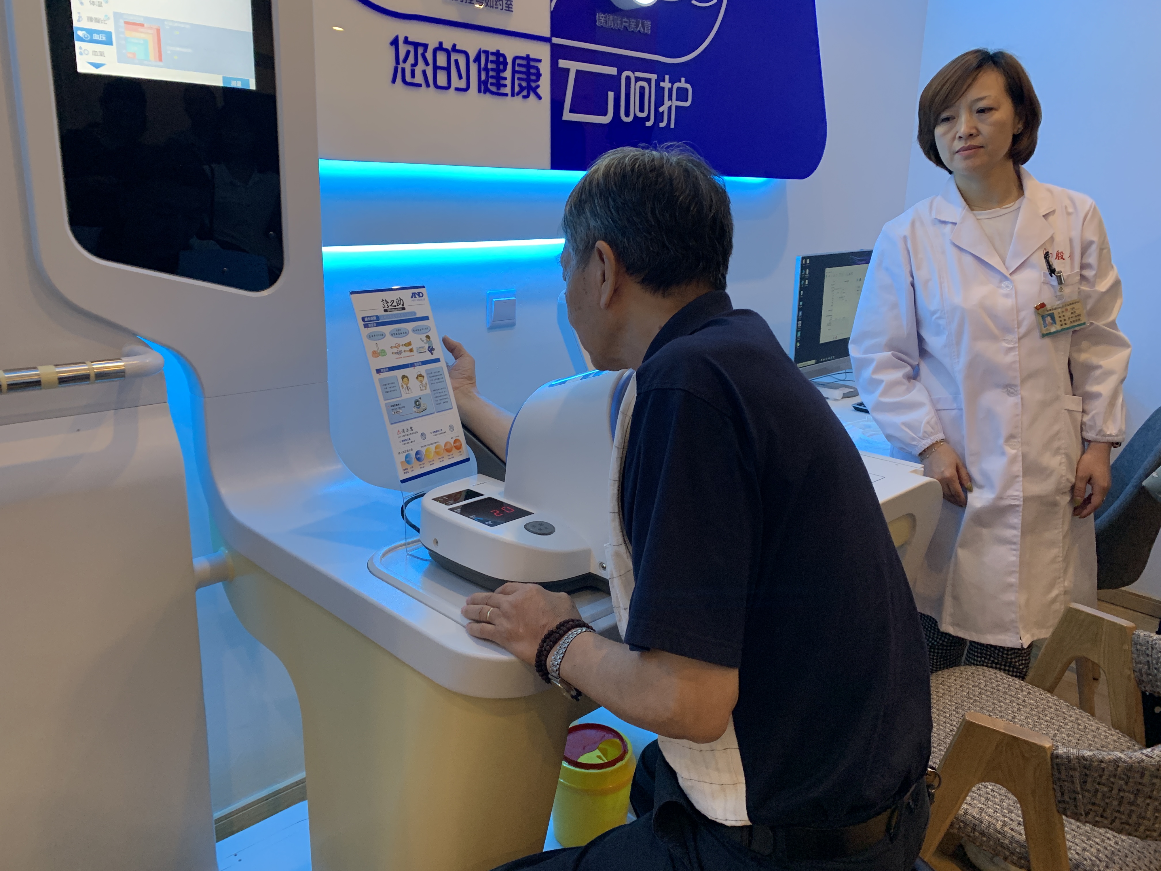 图说:朱老伯在家庭医生指导下,“尝鲜”智慧健康小屋