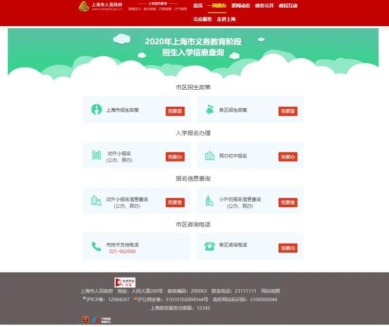 2020年“入学报名系统”继续和“中国上海一网通办”实现信息联动。家长访问市政府网站(www.shanghai.gov.cn)上的“一网通办”栏目,也可登录和查看孩子报名入学的相关信息。