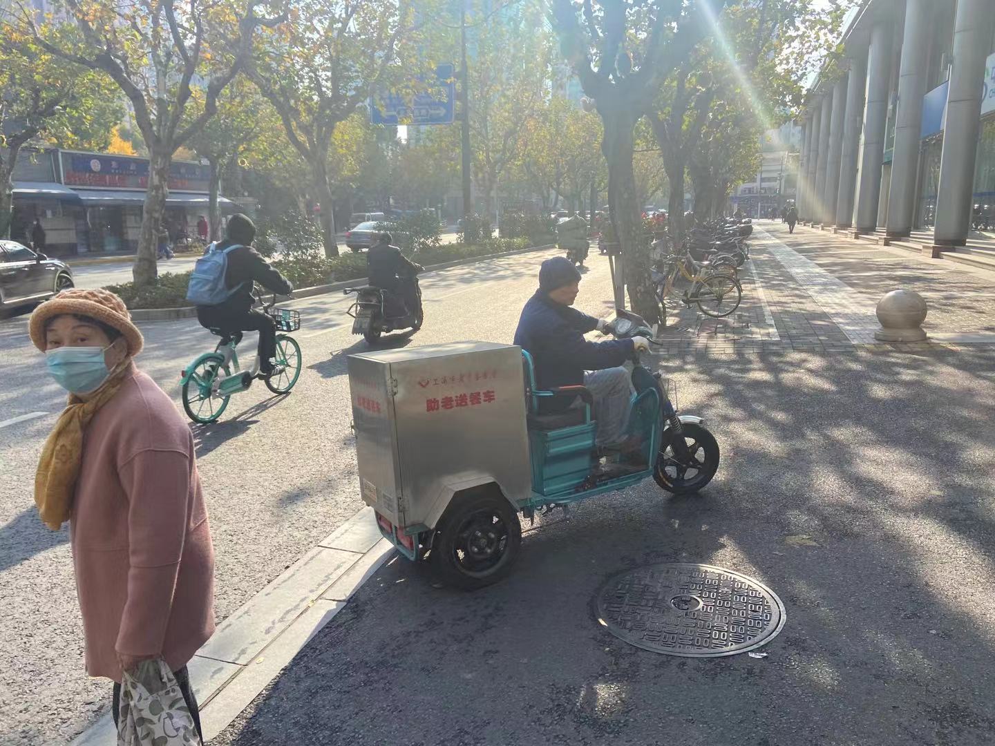 “我们九点就开始送餐了,先送到街道另两个助餐点,然后十点开始给老人们送饭,今天大约有35份,差不多12点前可以送完吧。”赵巍骑着驮有半人高保温送饭箱的“小电驴”,抵达当天的第一个送餐点——位于南京西路上的国际丽都城。