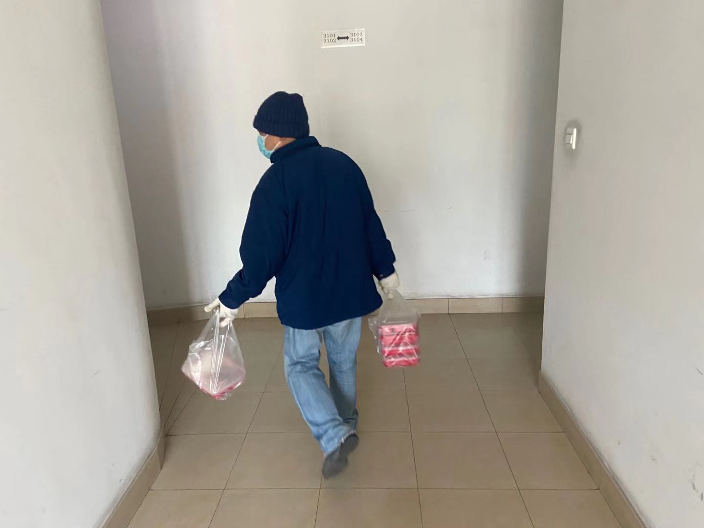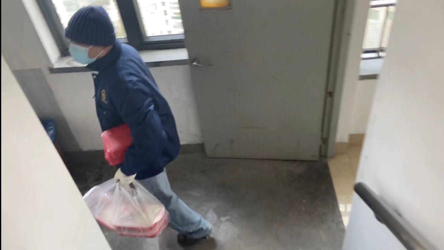 记者跟随赵巍进入2号楼,坐电梯来到31层,只见有一户门口放着一把小椅子,上面放了一个空了的红色饭盒。赵巍将热腾腾的饭盒放入一旁的消火栓箱内,拿走椅子上的空饭盒,敲了三下门,然后又急急离开。