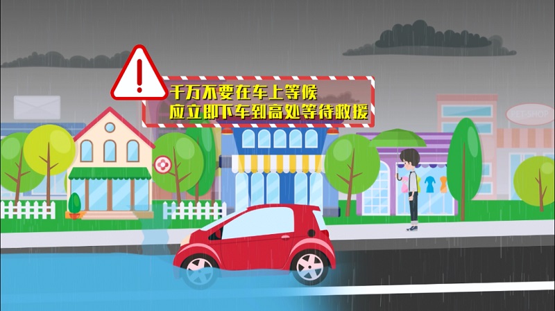 6.雨天汽车在低洼处下立交熄火,千万不要在车上等候,应立即下车到高处等待救援。