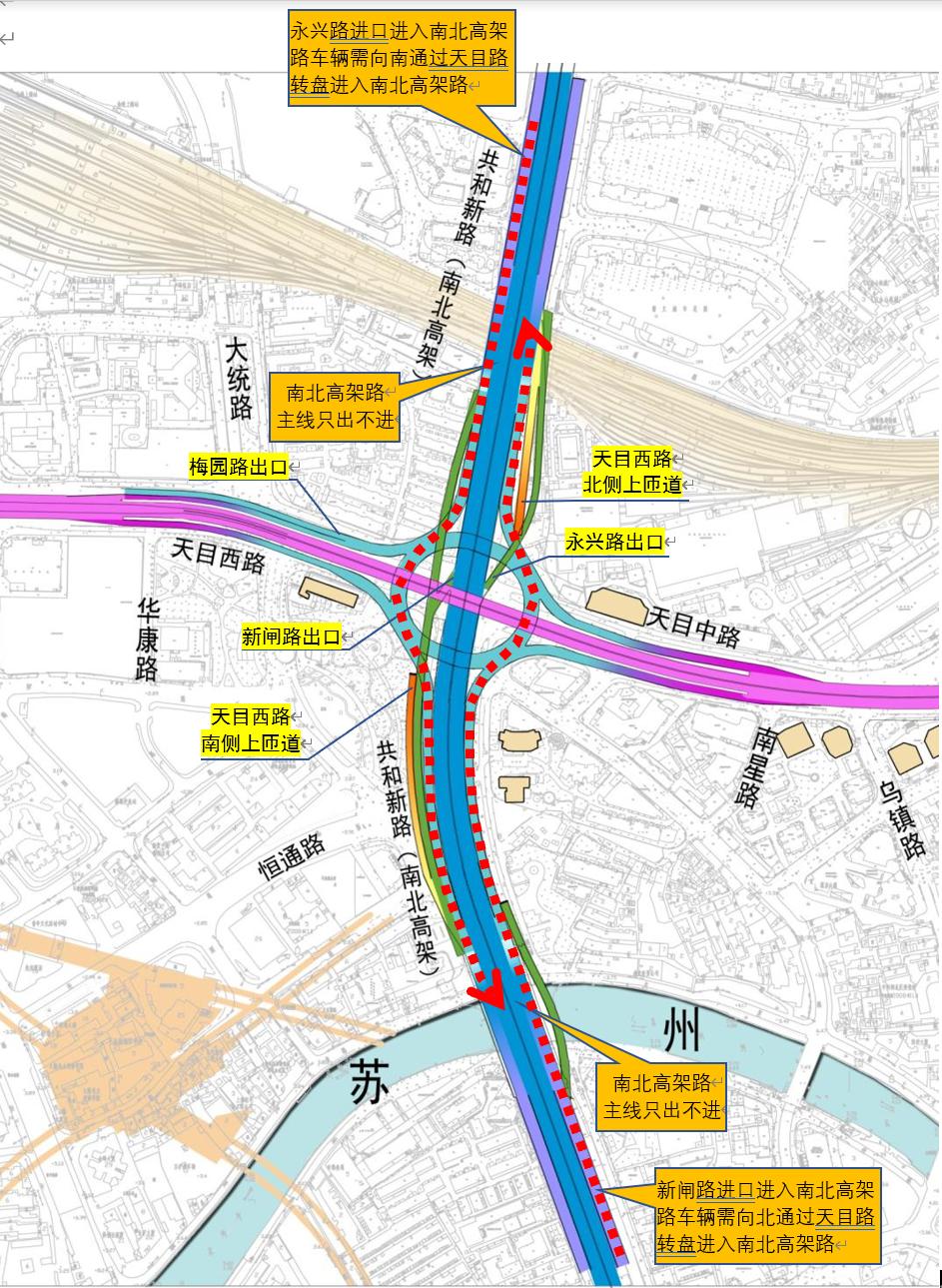 3、天目立交范围内南北高架主线段东西两侧将进出交通剥离,主线采用只出或者只进的形式。