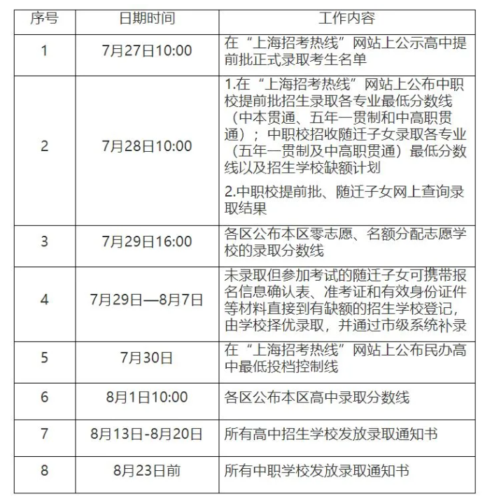 考生注意,7月19日18:00起,考生可通过“上海招考热线”网站,查询本次考试成绩 [注:八年级在籍在读考生初中学业水平考试历史科目成绩查询时间为7月23日] ,同时市教育考试院还将公布高中阶段各类学校最低投档控制分数线。对本人考试成绩有疑问的考生,可于7月20日至21日通过“上海招考热线”网站申请成绩复核,并于22日通过“上海招考热线”网站查看复核结果。